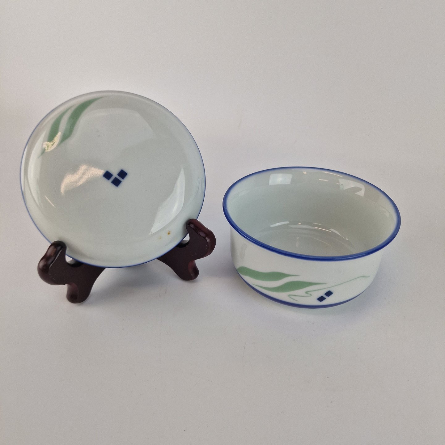 Springtime er af porcelæn, som er glaseret hvidt, malet med blå striber og abstrakt mønster i en lys grøn og blå farve.