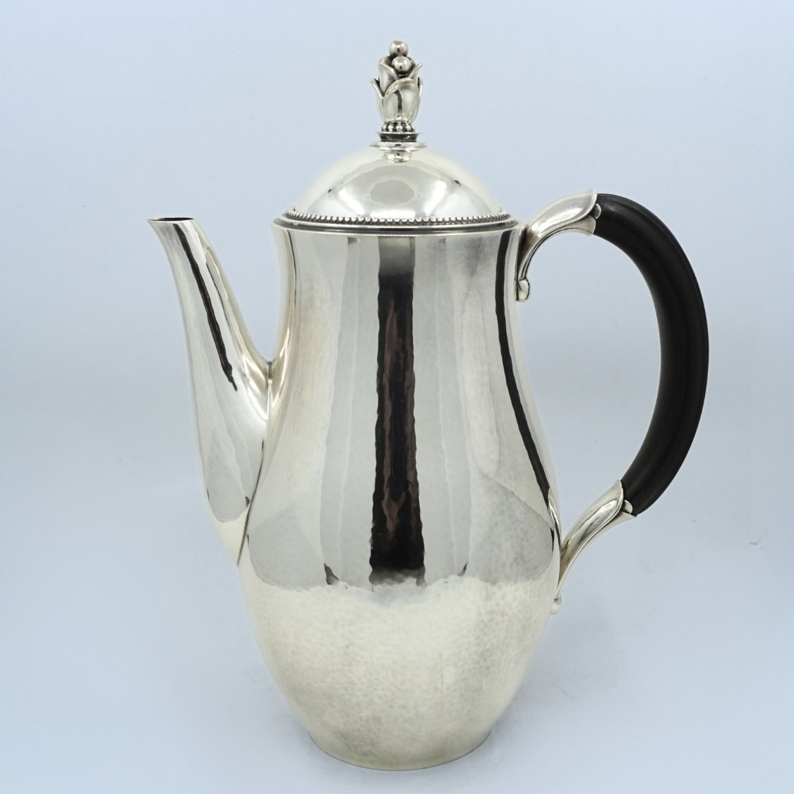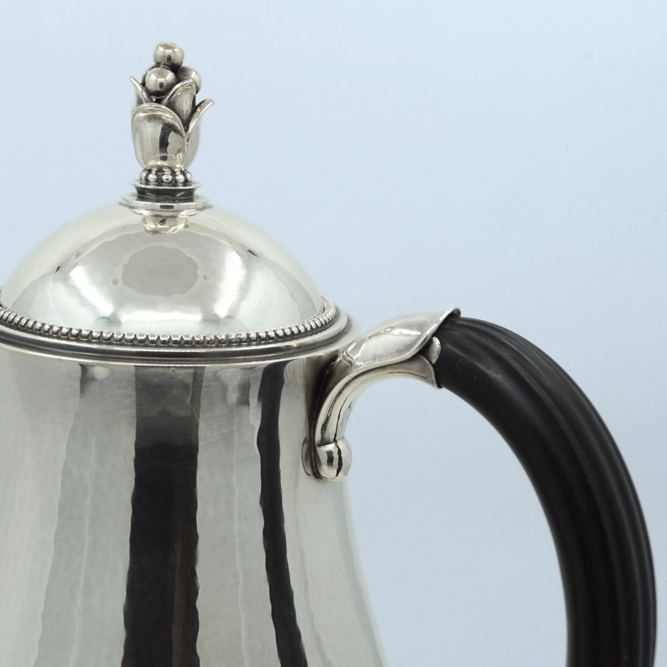 Georg Jensen kaffe- og te sæt af let hamret sterlingsølv, designet af Harald Nielsen.