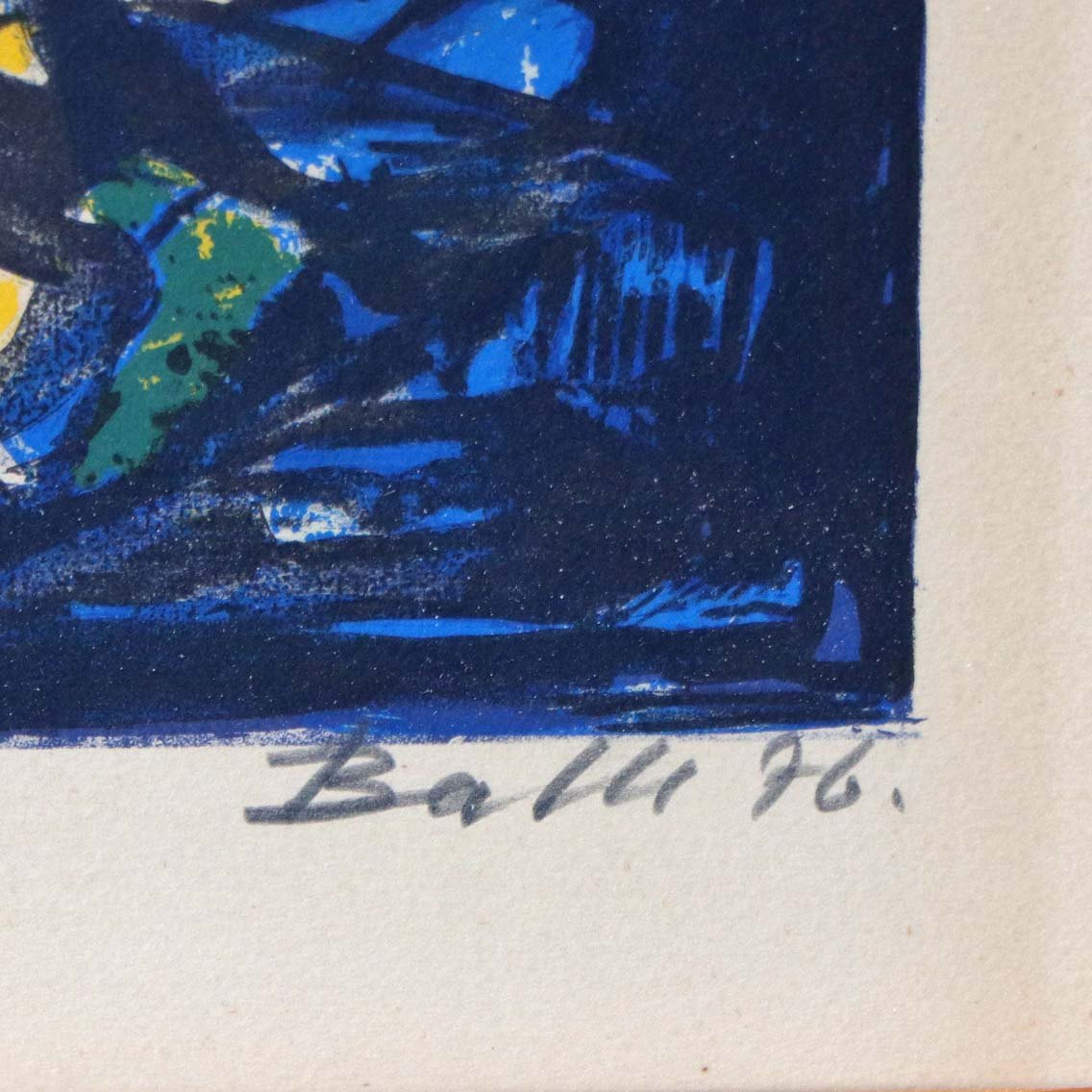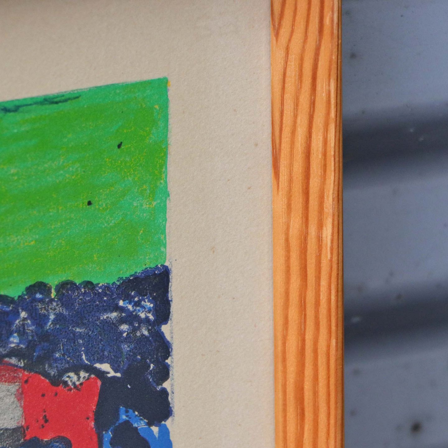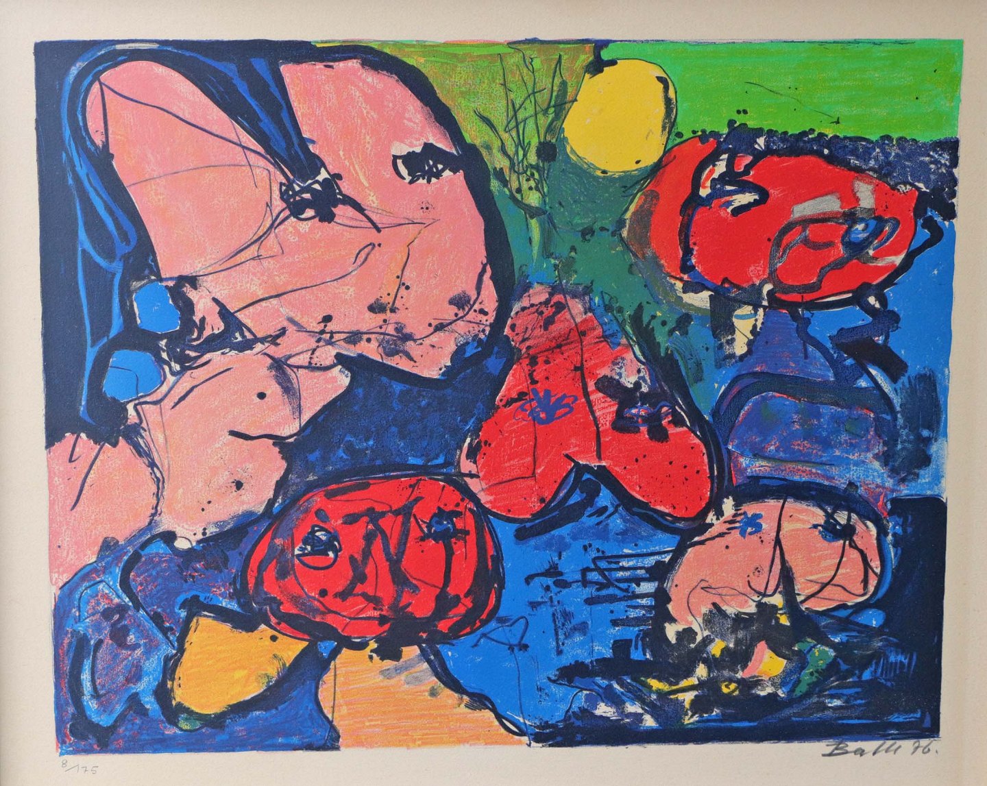 Indrammet litografi i ramme. Abstrakt litografisk tryk nr 8/175 i blå, rød, grøn, orange og gule farver