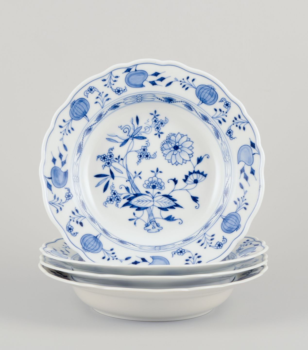 Meissen, Tyskland. Løgmønstret. Fire store dybe tallerkner.