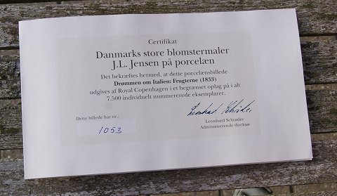 Danmarks store blomstermaler J.L. Jensen på porcelæn. Porcelæns maleriet har nr. 1053 ud af 7.500 eksemplarer og udgivet af Royal Copenhagen. Det har afskalning på rammens venstre side (se ekstra foto).