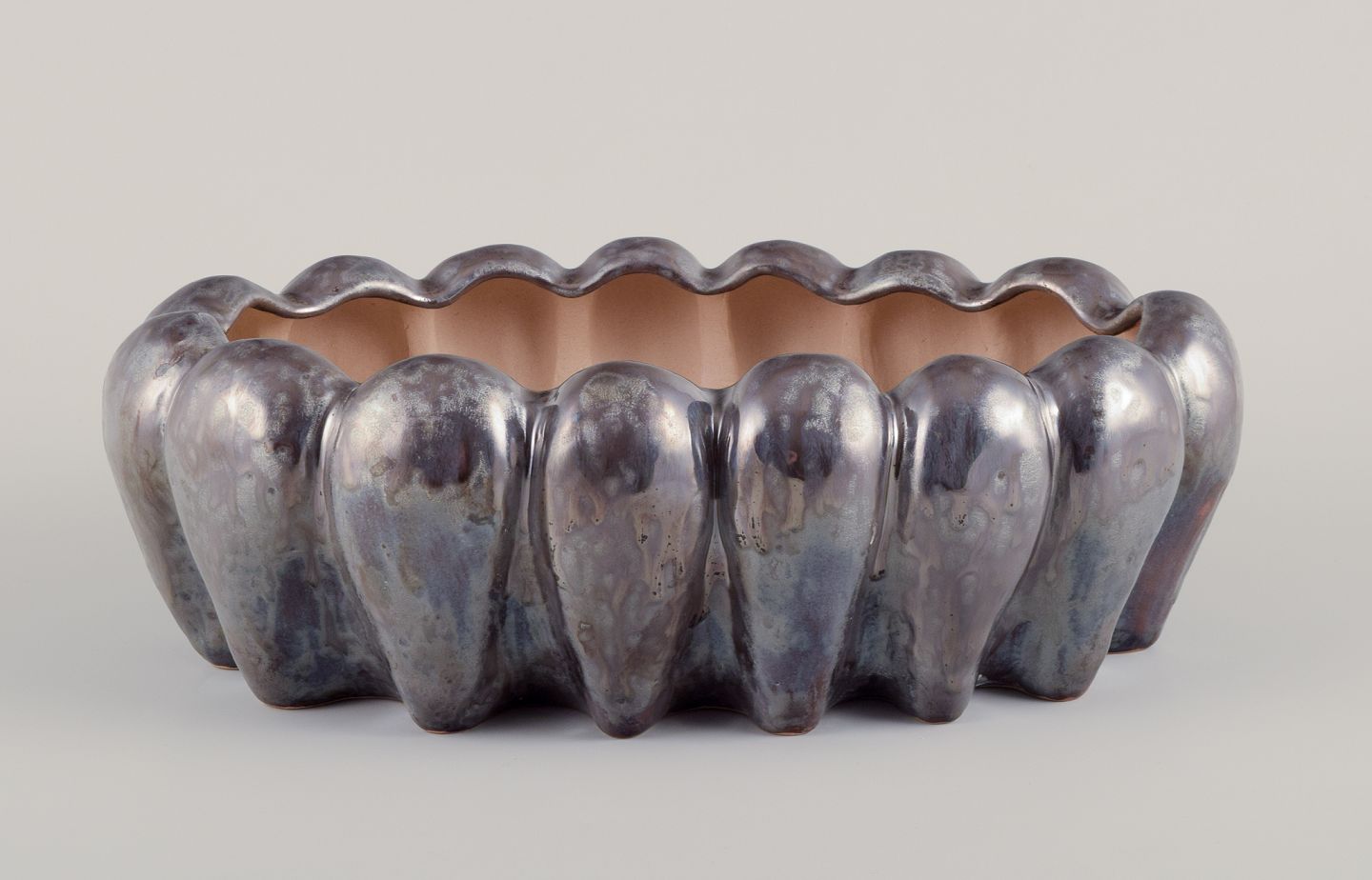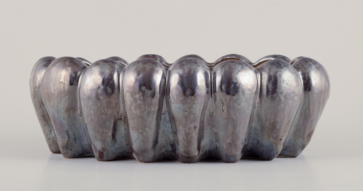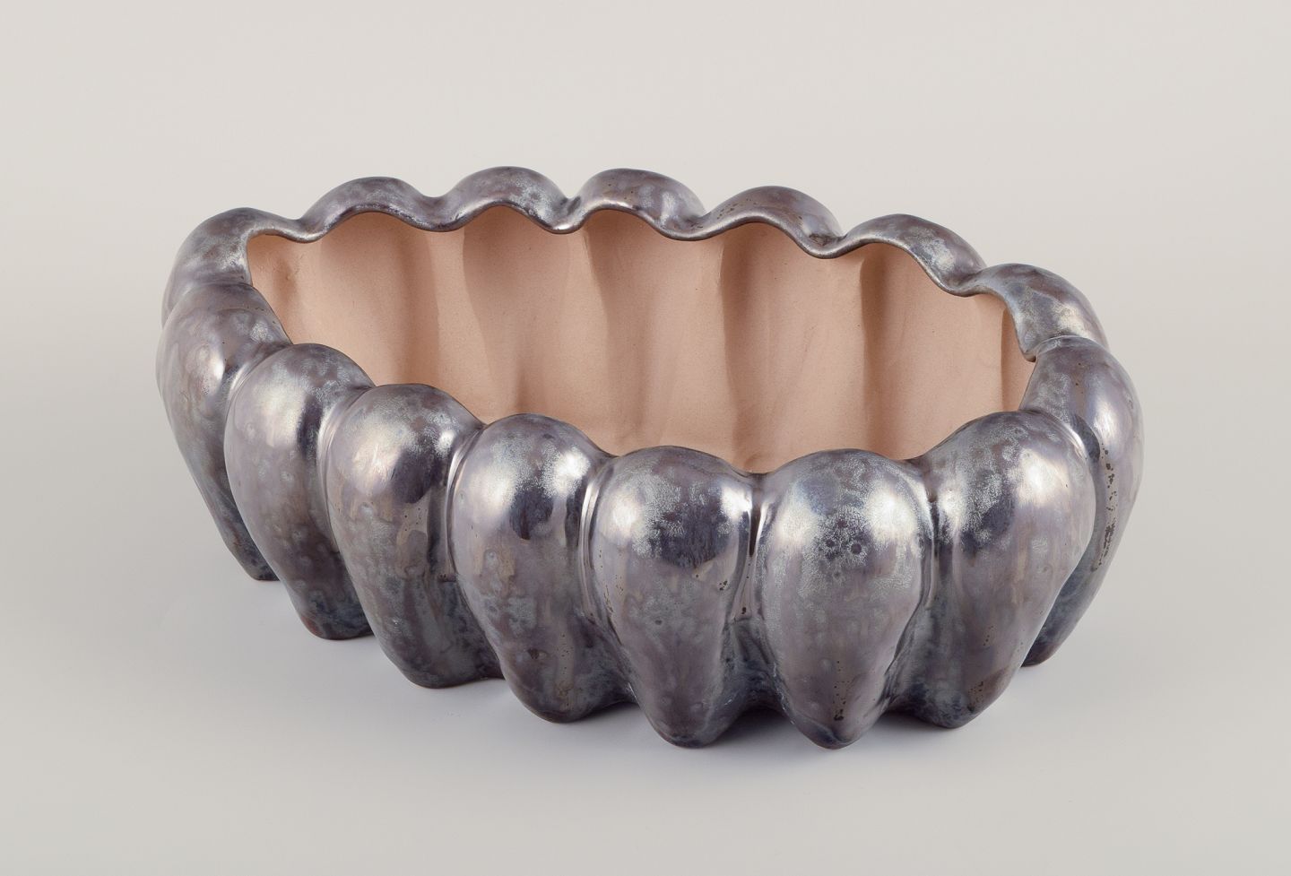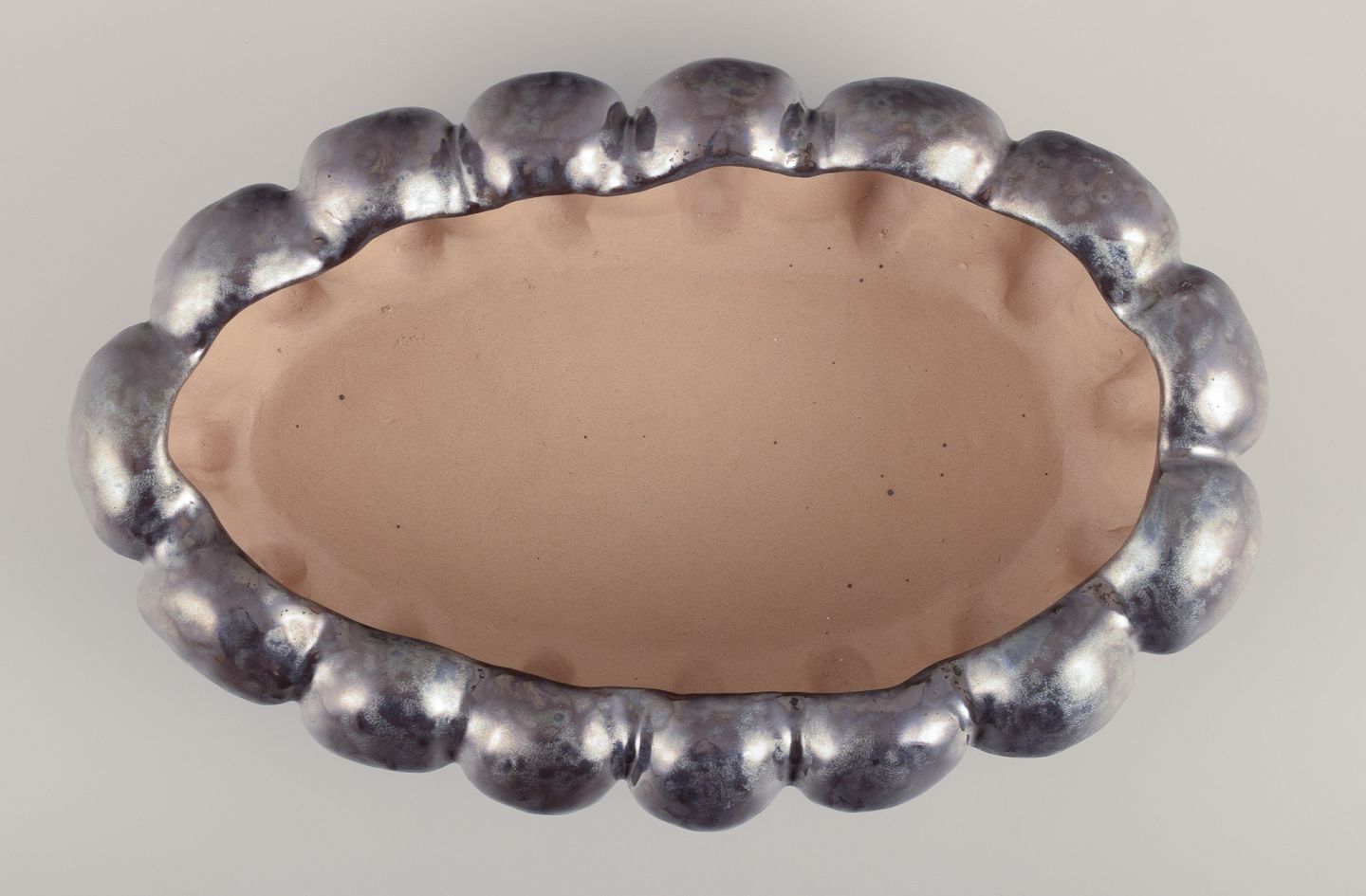 Stor oval vase med iøjnefaldende metallisk glasur med spil i. Indeni ses stentøjsleret i sin uglaserede form, gylden og smukt brændt. Udenpå stråler den metalliske glasur med hvad der næsten ligner små stjerner.