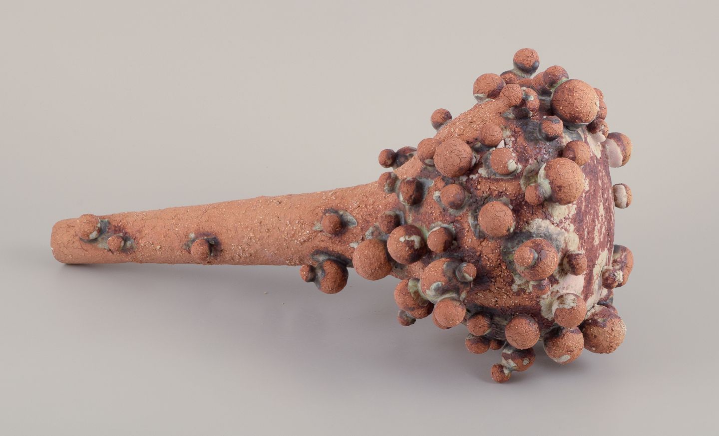 Høj vase med flaskehals prydet med små kugler af stentøjsler. Skulpturen er kun delvist glaseret, med en hvid-sort glasur med irgrønne nister.