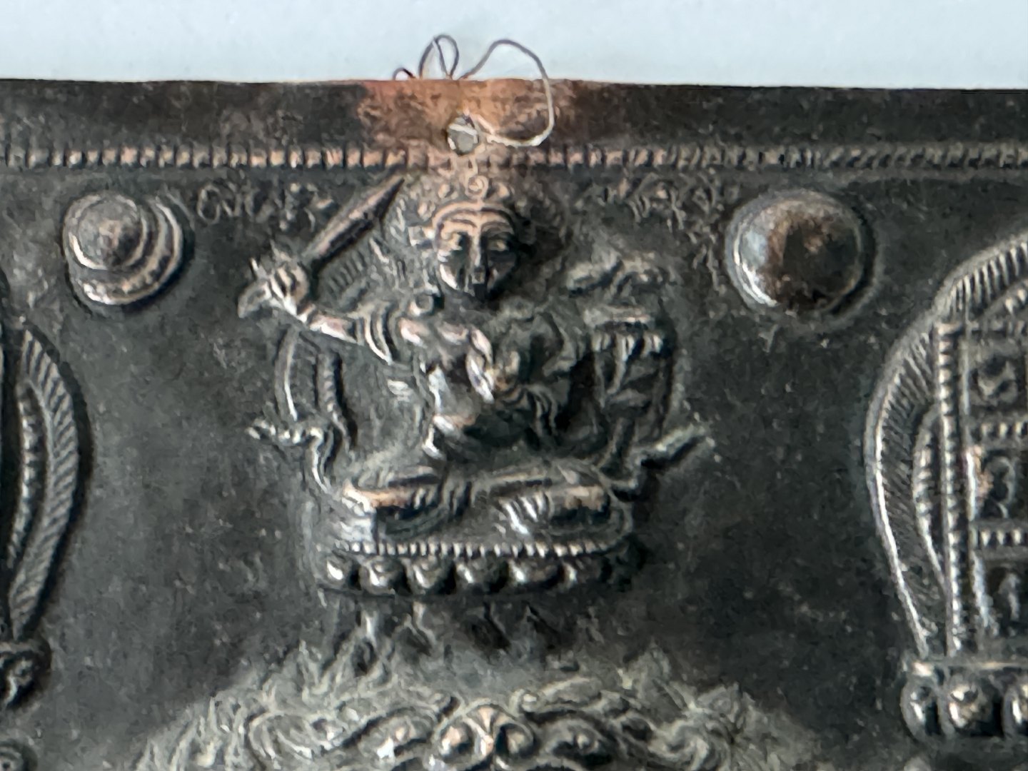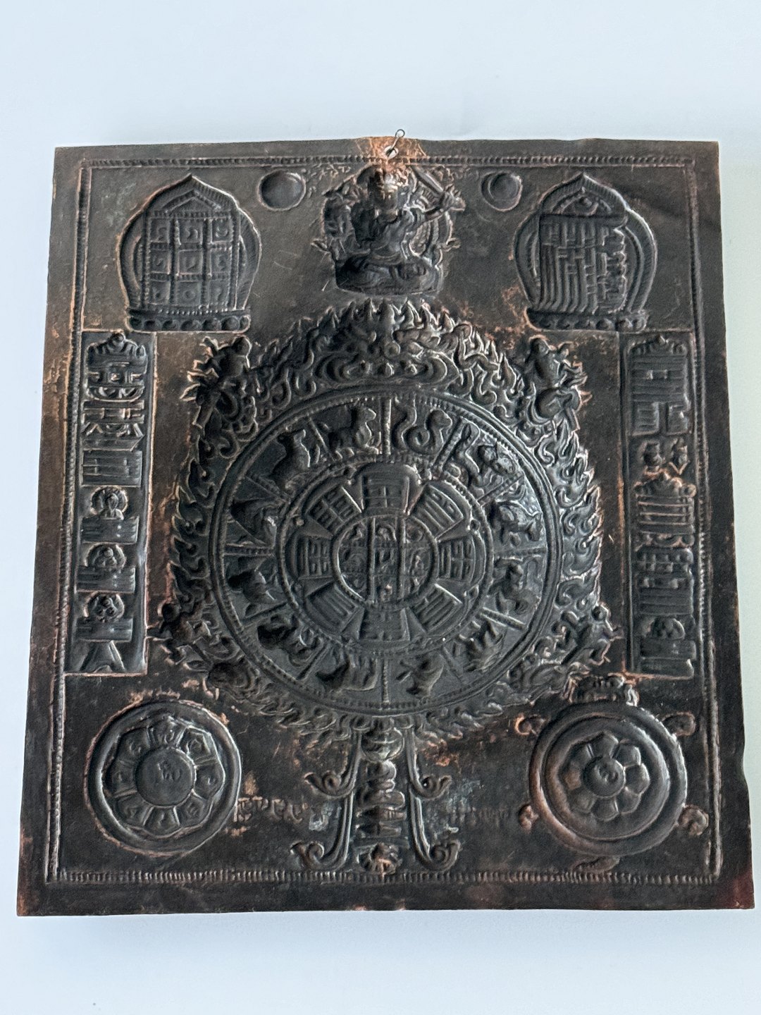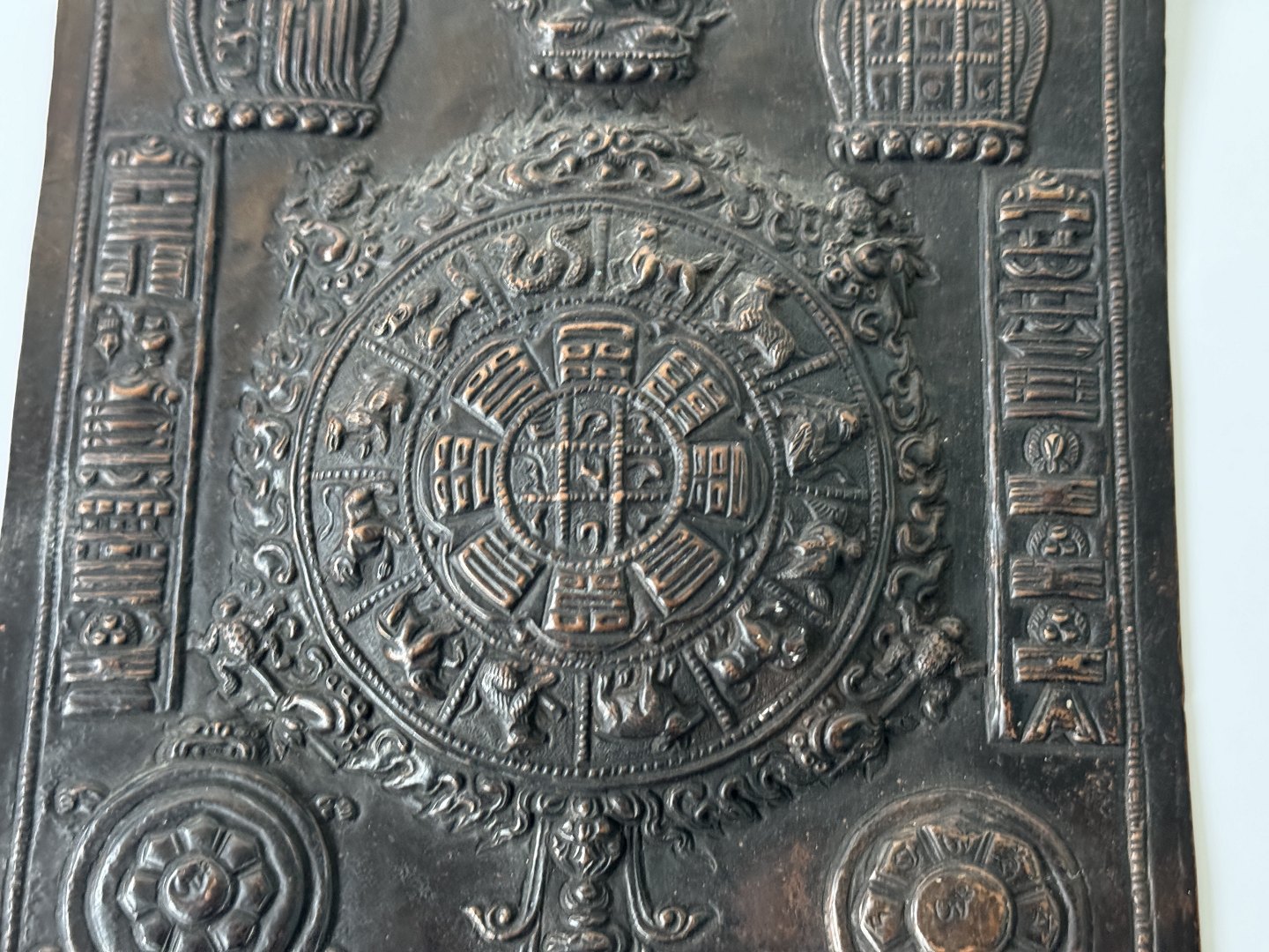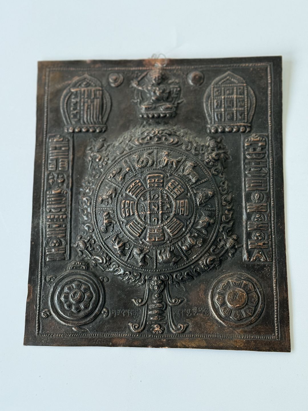 Buddhistisk vægophæng thanga i metal. 20. Århundrede. 19 x 16,5 cm. Sanskrit tekst nederst på billedet plus zodiac med forskellige dyr: slange, kanin, løve m.fl. Øverst i billedet finder man Buddha selv.
