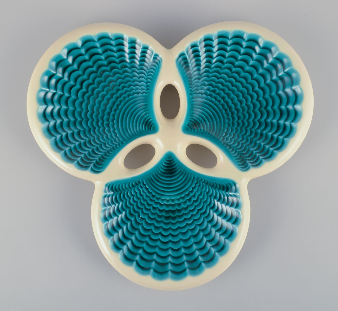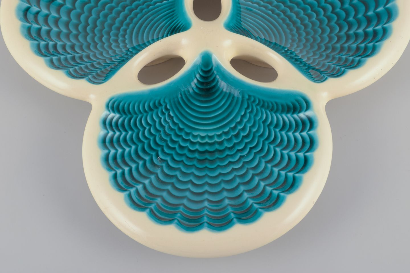 Fransk keramikfad. Tredelt. Muslingeformet. Turkis og cremefarvet glasur.