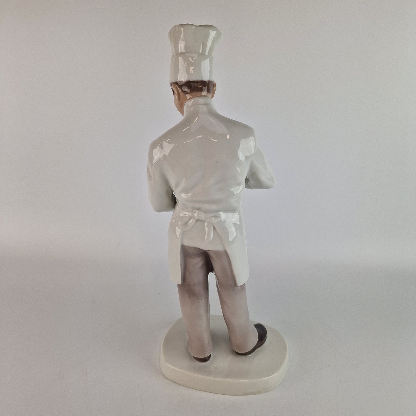 Figur af porcelæn, formet som en bager med høj hat og en skål i hånden. Konditor
