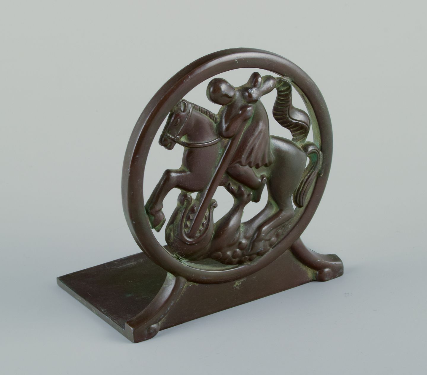 Just Andersen, Danmark. Et par Art Deco bogstøtter i diskometal med Sankt Georg og dragen.