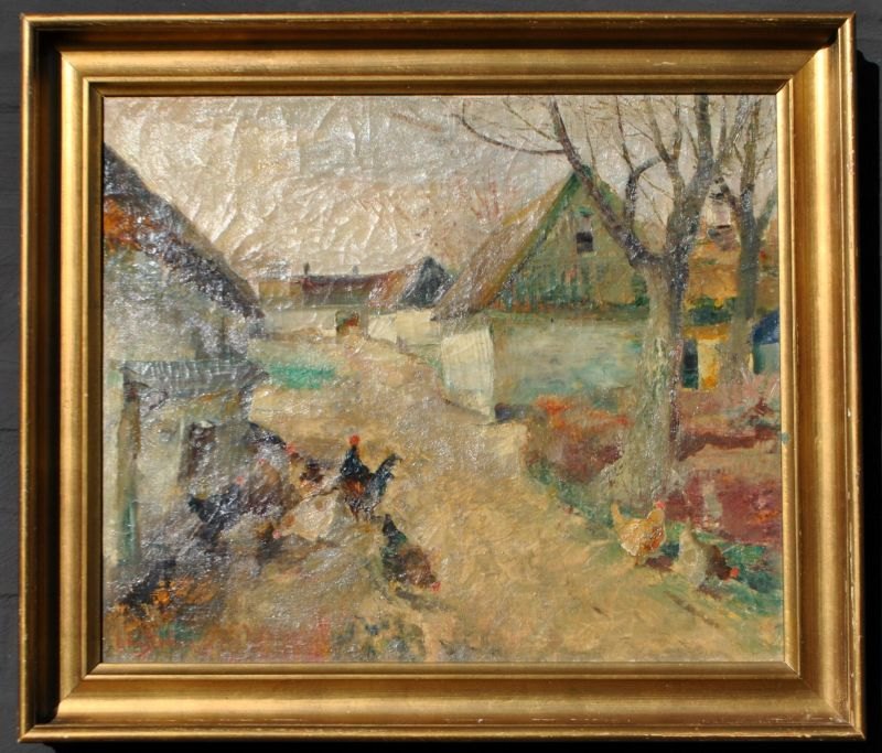 Jacobsen, Ludvig (1890 - 1957) Denmark: Chickens at the farm. 1923. Oil on canvas. Signed "Ludvig Jacobsen 23". 49 x 58 cm.