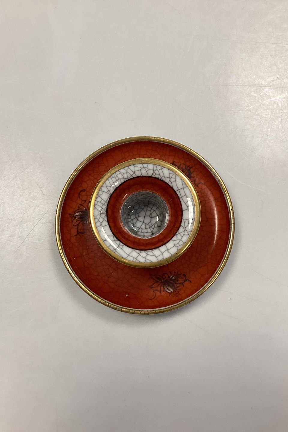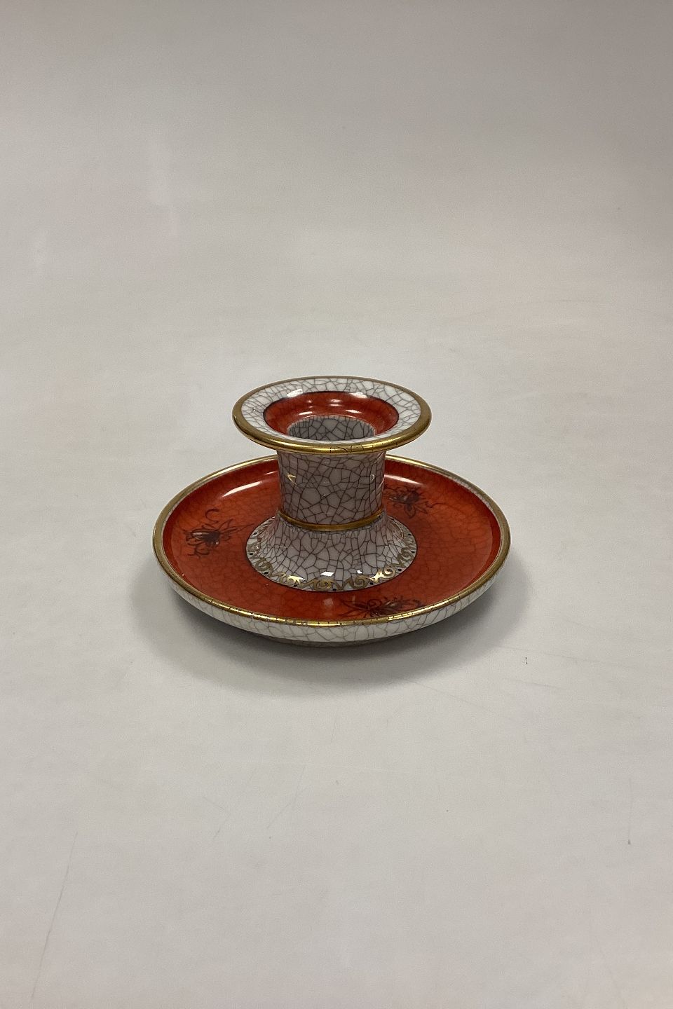Dahl Jensen Krakelé Lysestage No. 178/578. Dekoration i sienarød, hvid og guld. Måler 6 cm x 12,5 cm.