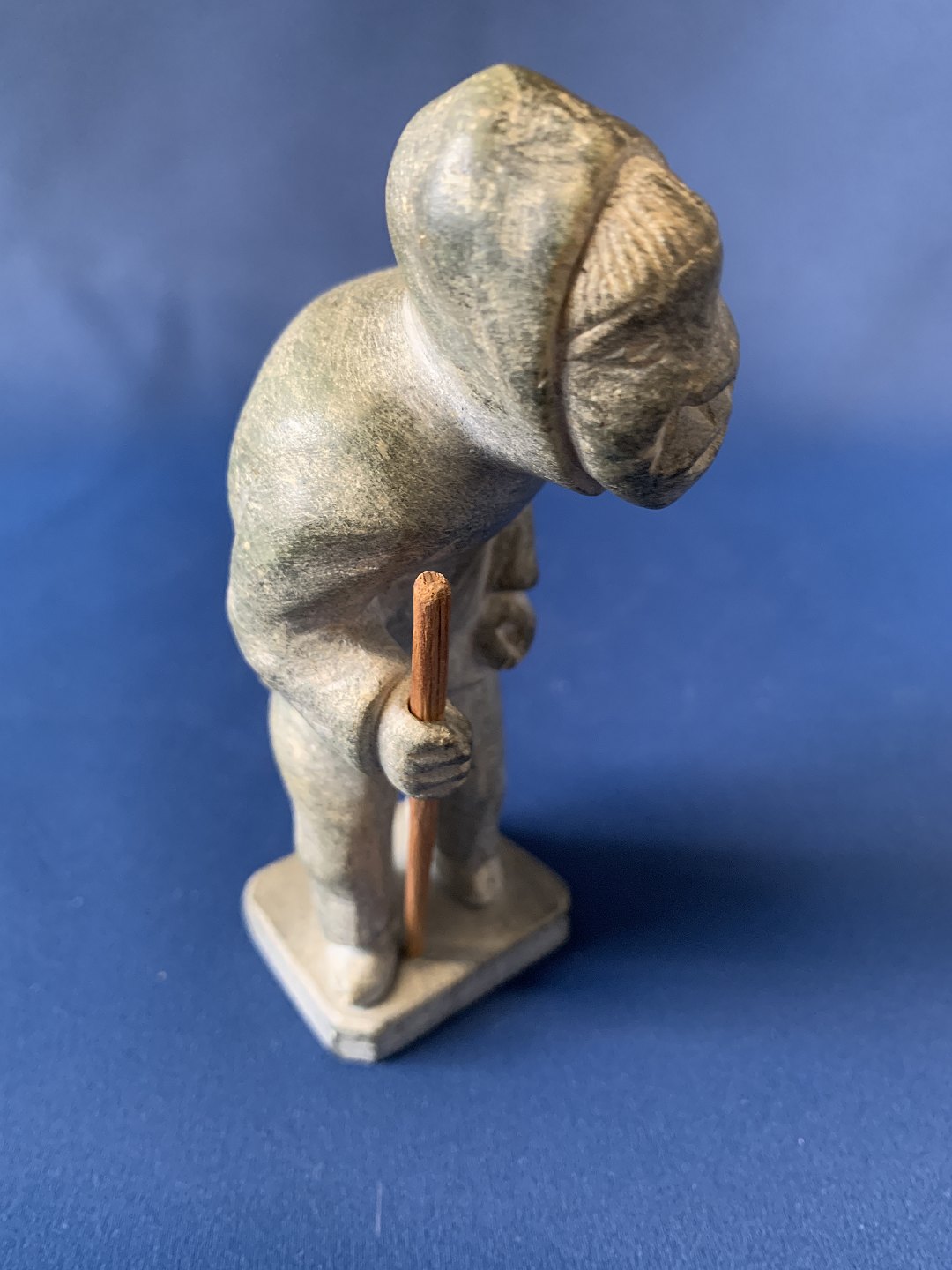 Smuk Grønlandsk fedtstensfigur, udformet som mand. Fedtstenskunst er klassisk Grønlandsk håndværk når det er bedst. I Grønland er fedtsten blevet anvendt som kunst og redskaber i over 3000 år. Da figurerne altid er forskellige og udtryk for godt håndarbejde, er fedstensfigurer ofte en efterspurgt kunstgenstand.