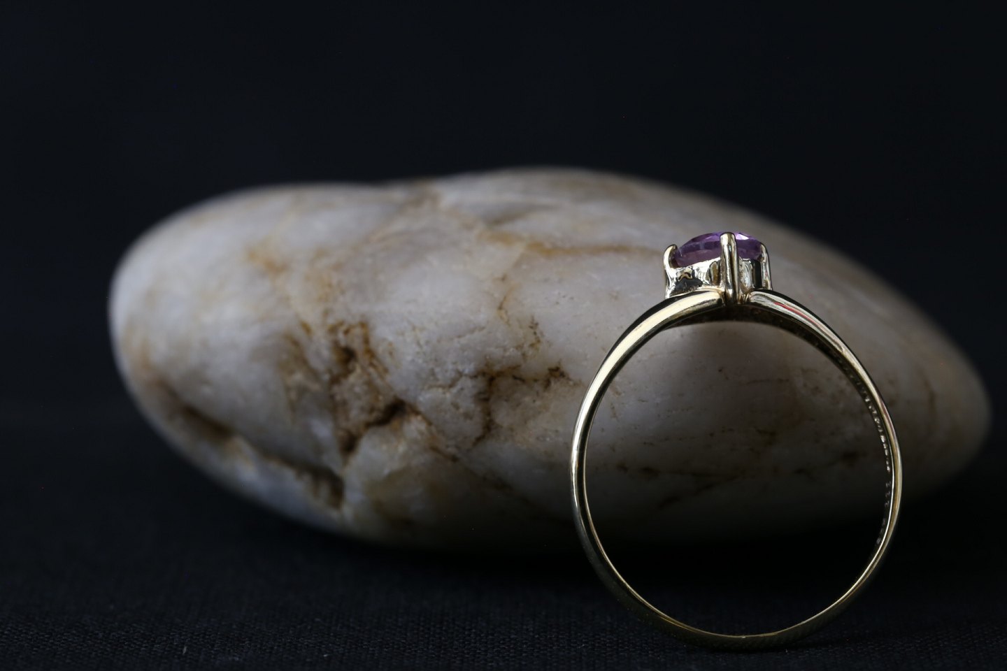 Flot guldring med lilla amatyst, udført i enkelt design. Den lille amatyst giver ringen liv, og fuldender ringens enkle design. Guldringe er flotte smykker der kan bruges til både hverdag og fest.