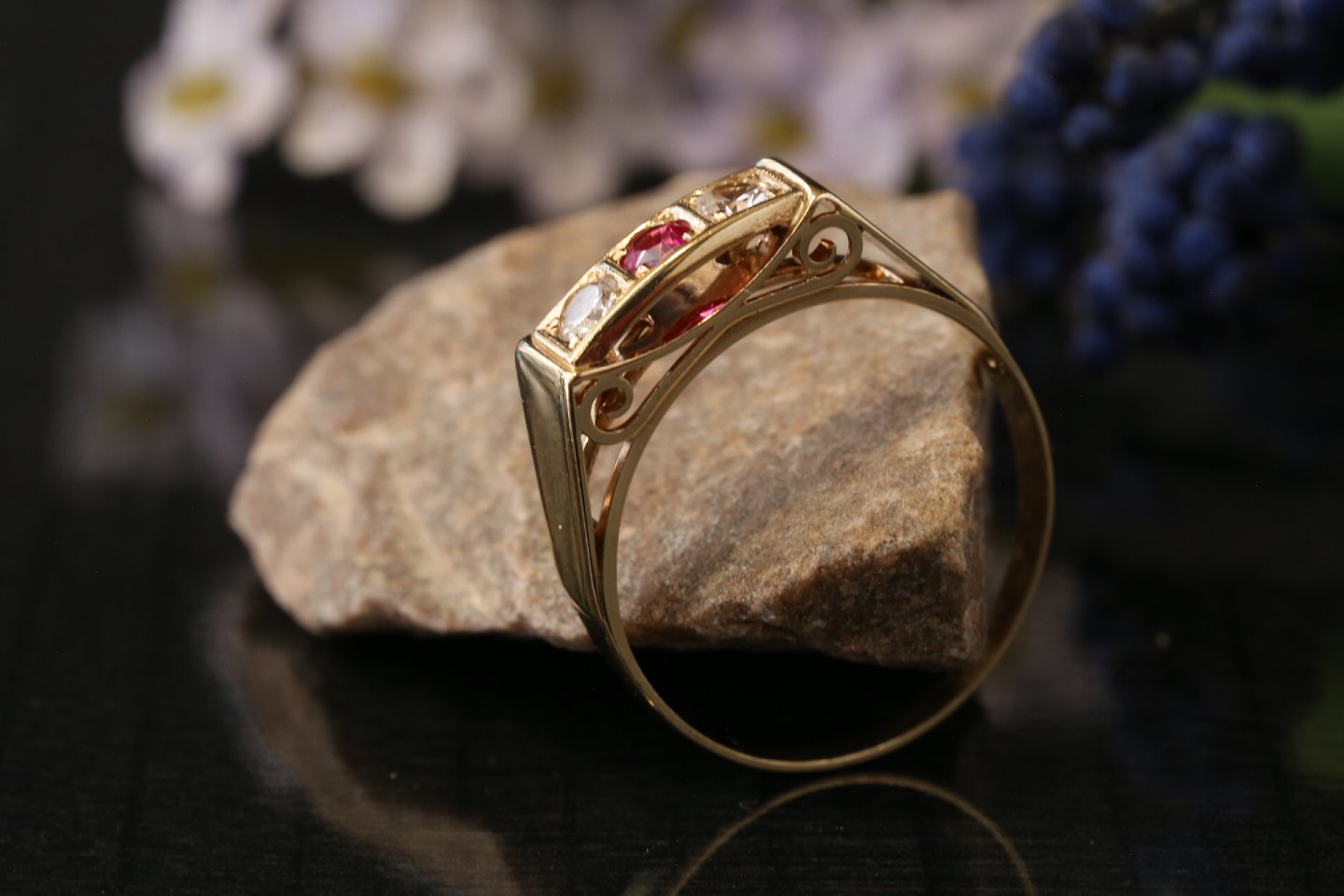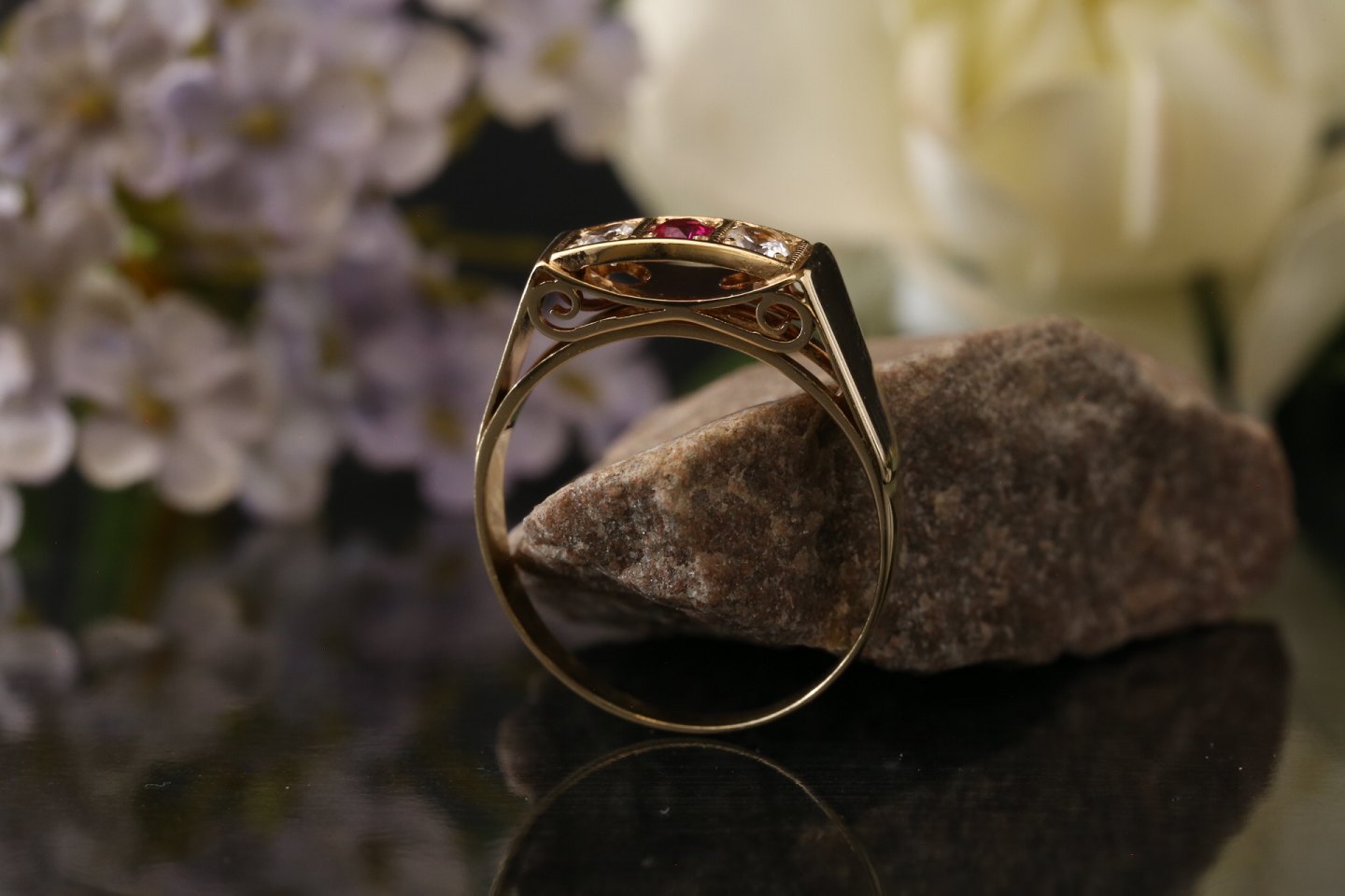 Flot damering med blikfang og antikke undertoner. Ringen er opbygget enkelt, men huset er opbygget i flere lag med flotte bløde linjer. Den røde rubin fanger straks blikket, og de to klare sten giver flot kontrast. Ringen kan bæres sammen med andre ringe, og give flot liv på hånden.