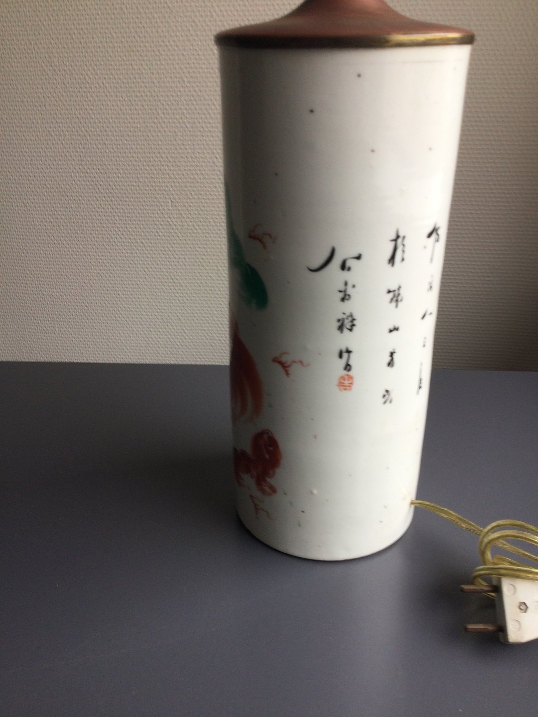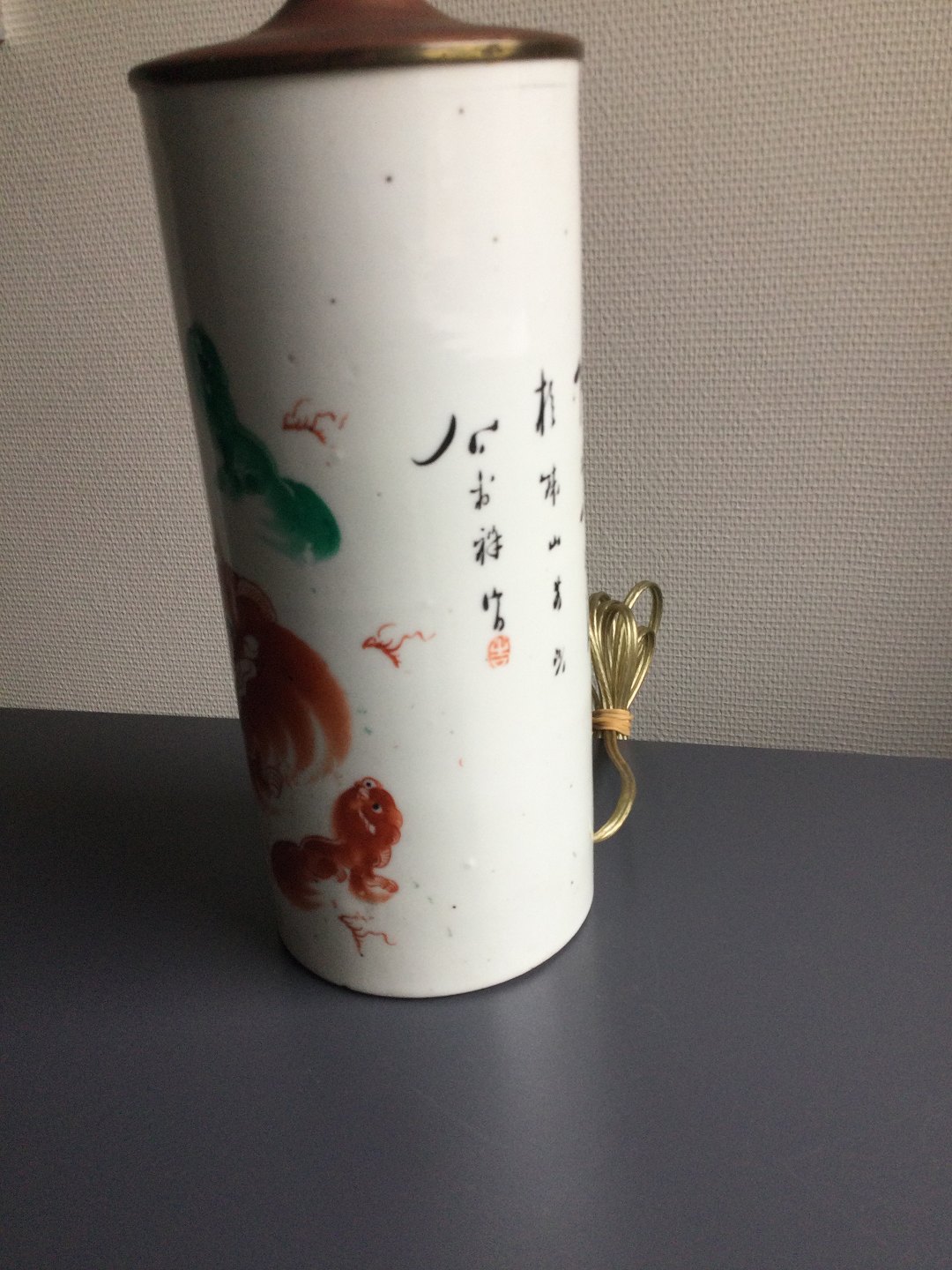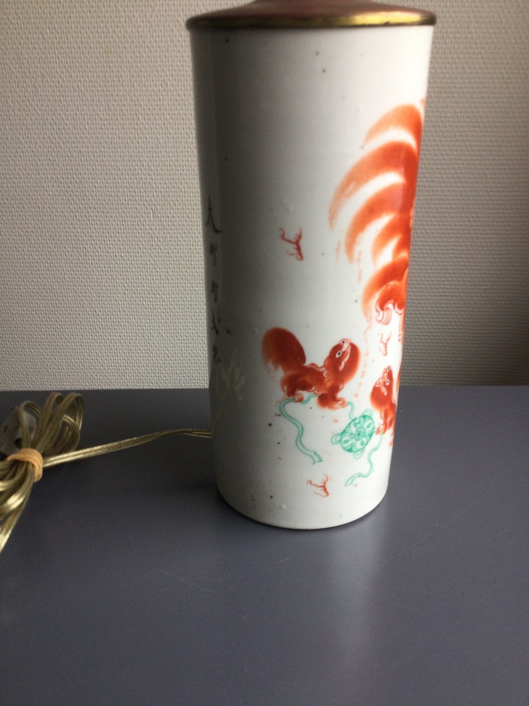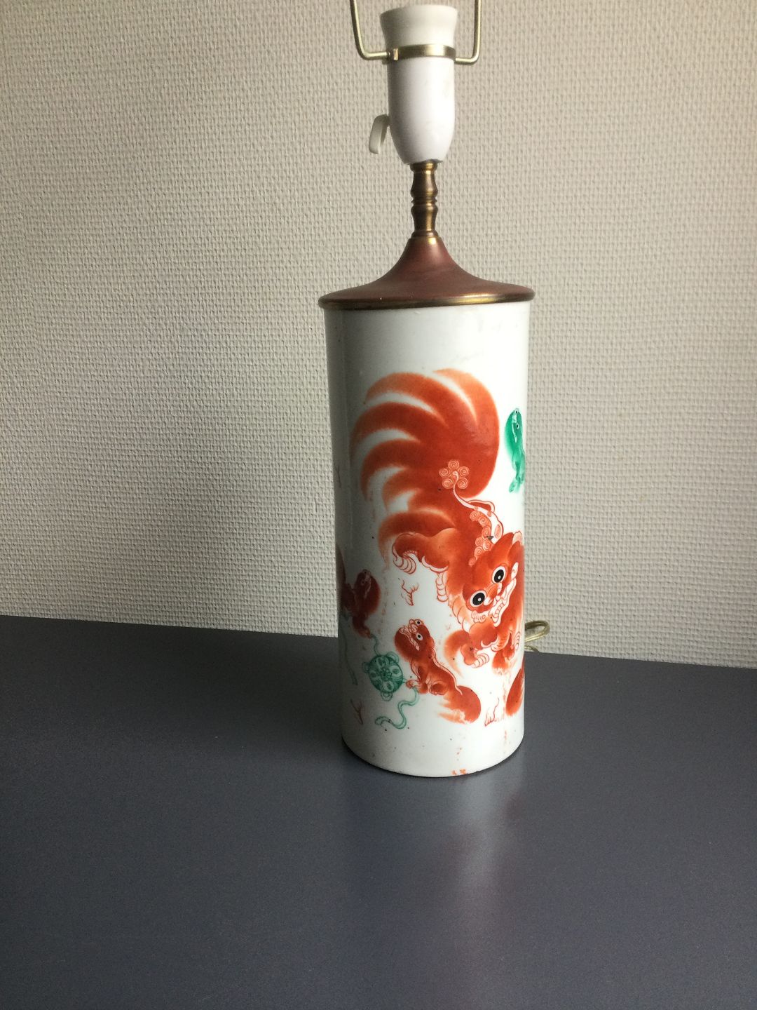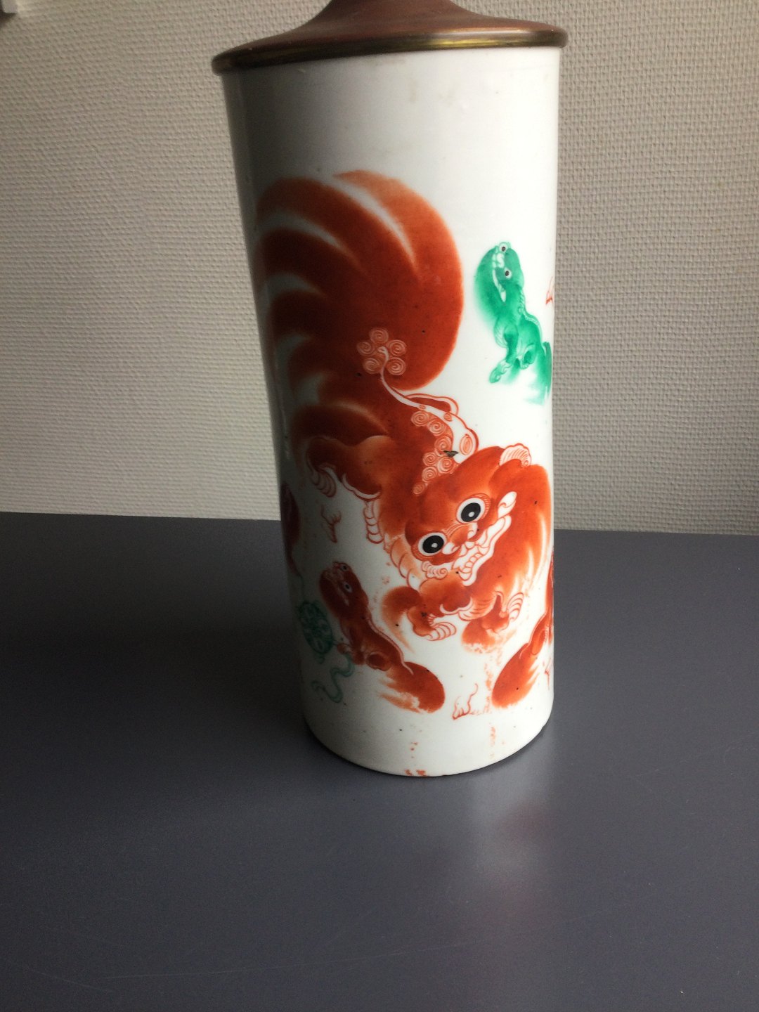 Polykromt dekoreret med orange og grønne fu-hunde eller løver samt skriftstegn.