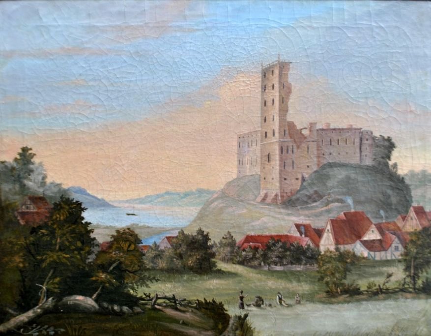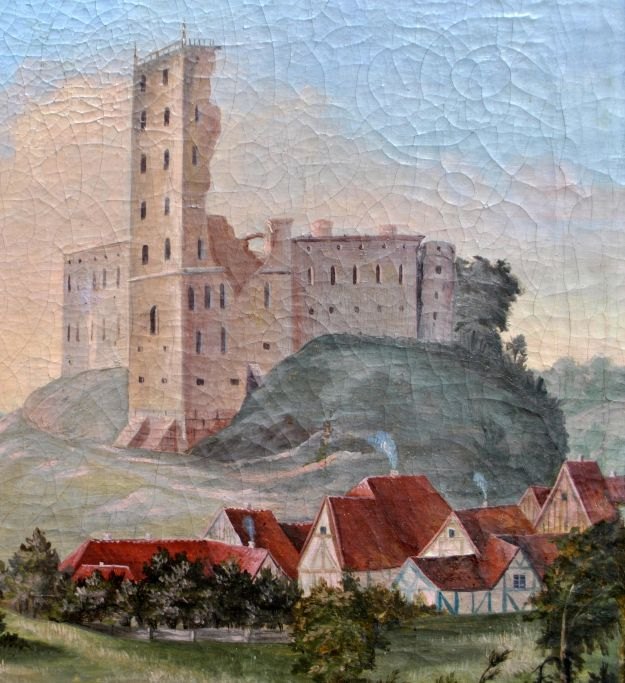 Dansk kunstner (19. årh): Prospekt af Kolding Slots Ruiner med en Del af Byen og dens Omegn, set fra den søndre Side. Olie på lærred, opklæbet på træplade. Signeret: O.S. 57 x 73 cm. Skitse - dagslys.