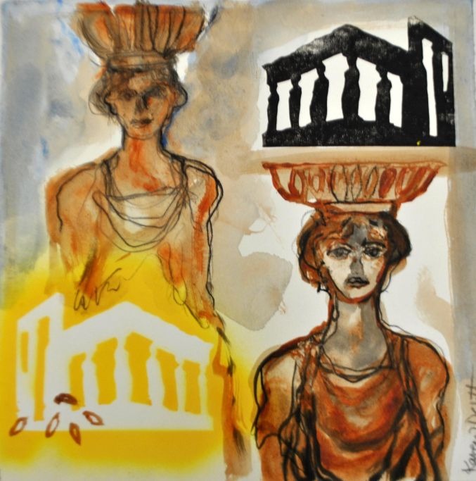 Degett, Karen (1954 - 2011) Danmark: Karyatider. Akvarel og tryk på papir. Signeret: Karen Degett. 39,5 x 39,5 cm.