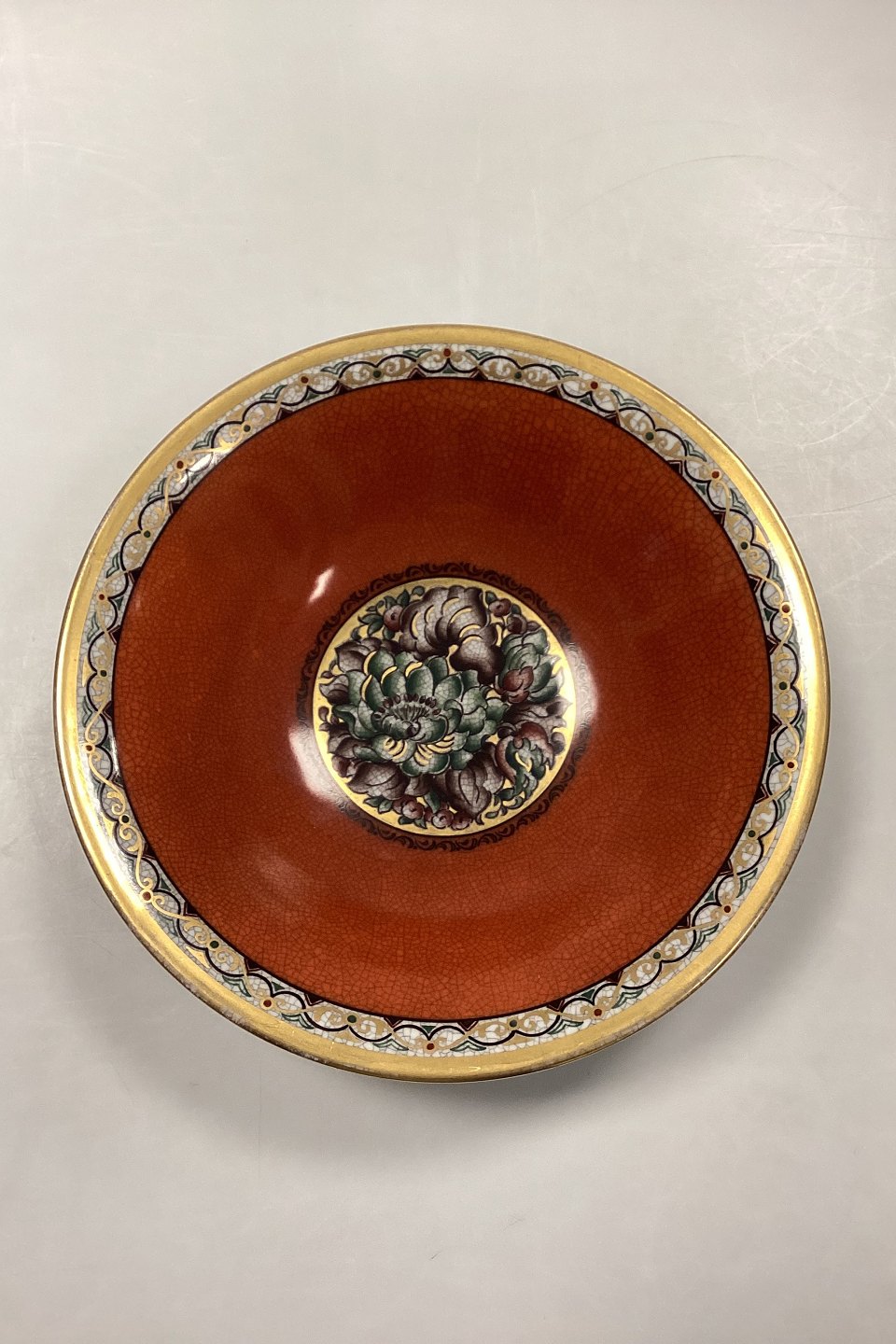 Dahl Jensen Craquelé Skål No. 142/644. Dekoration i siena rød, grøn, hvid og guld. Lettere slid på guldkanten.