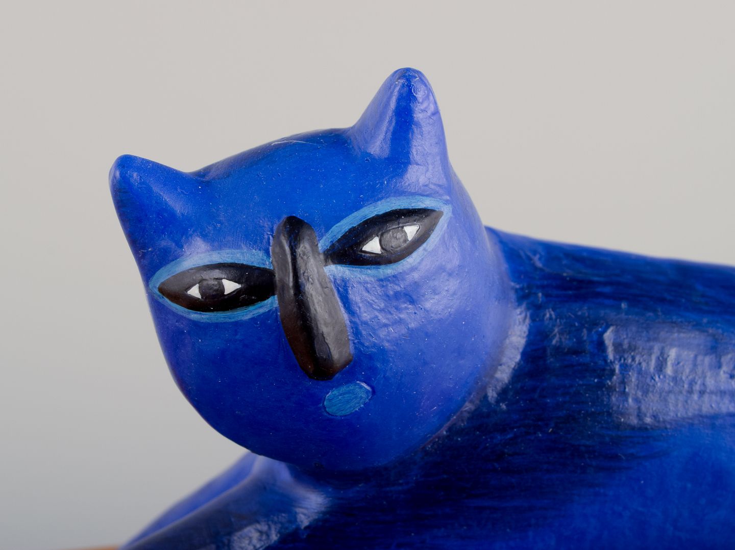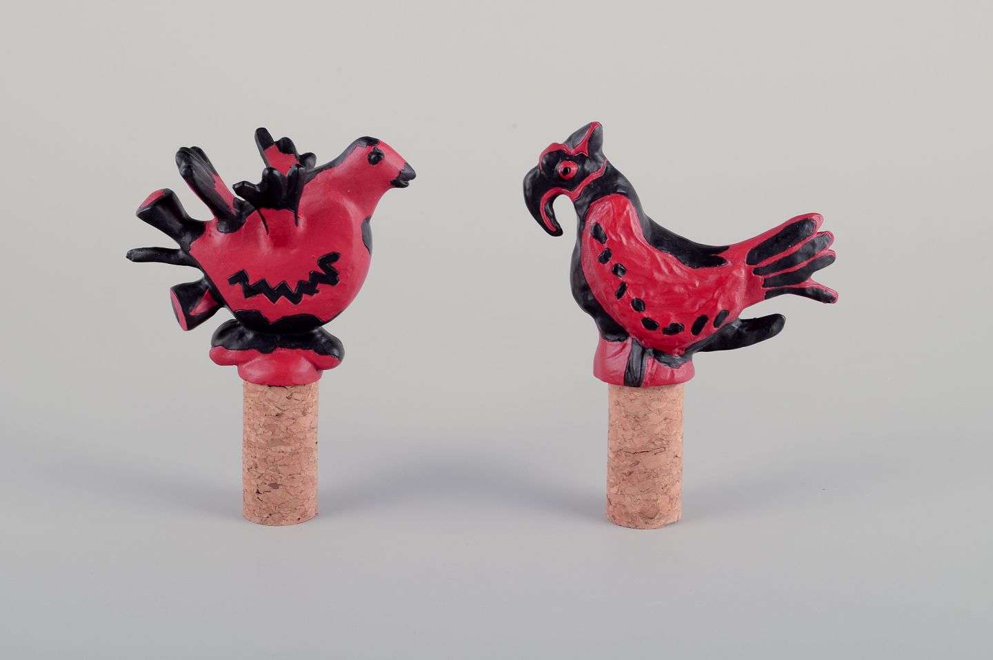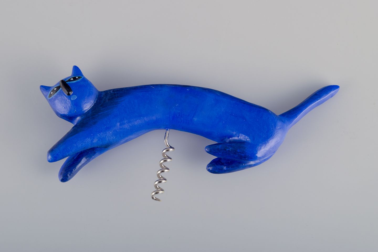 Blue cat (corkscrew) and two red birds (mounted on cork stoppers).