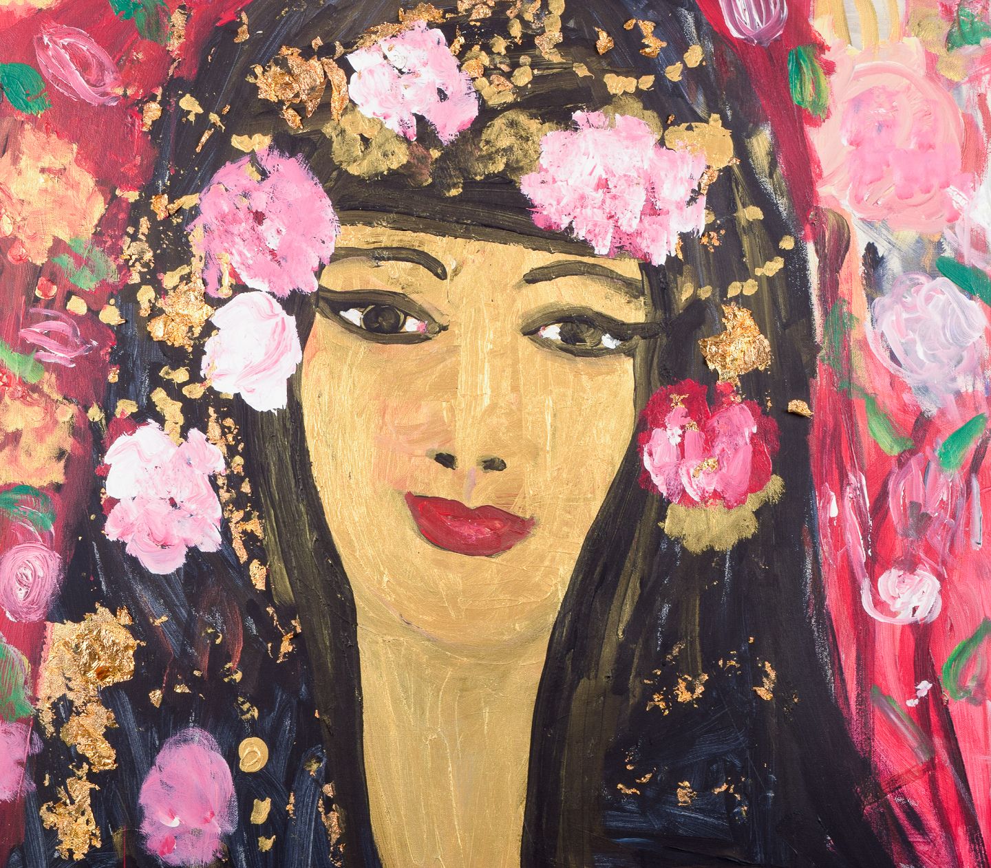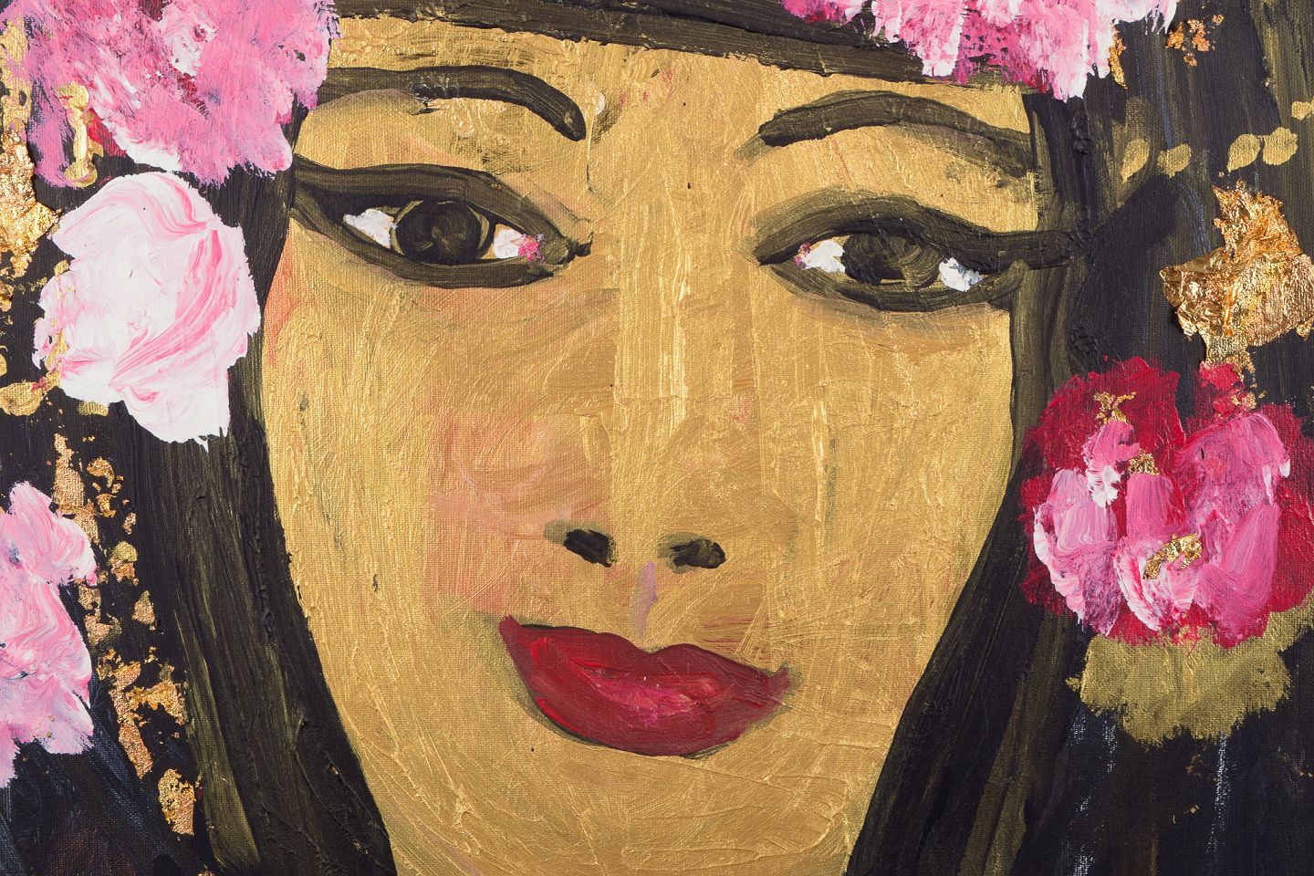 Ung kvinde med blomster i håret. Bladguld i hår.