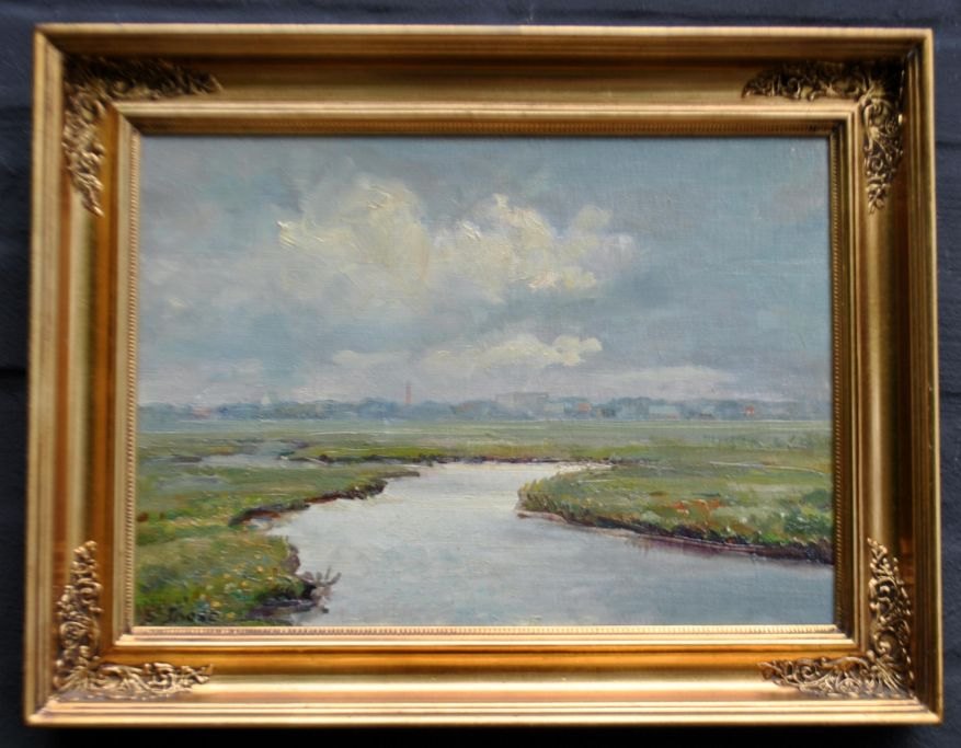 Frost, Sergius (1900 - 1994) Danmark: Tarm Å set mod Skjern, 1970. Olie på lærred. Signeret S. Frost. 26,5 x 36,5 cm.