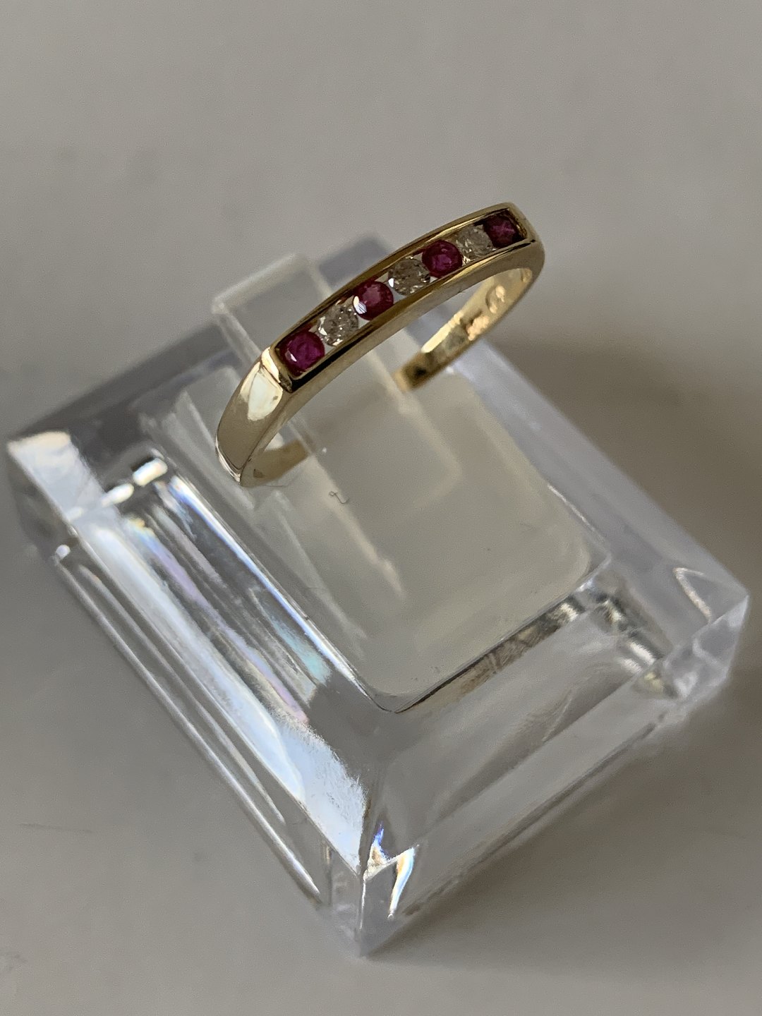 Alliancering i 14 karat guld, med indlagte rubiner og brillanter. Størrelse. 57