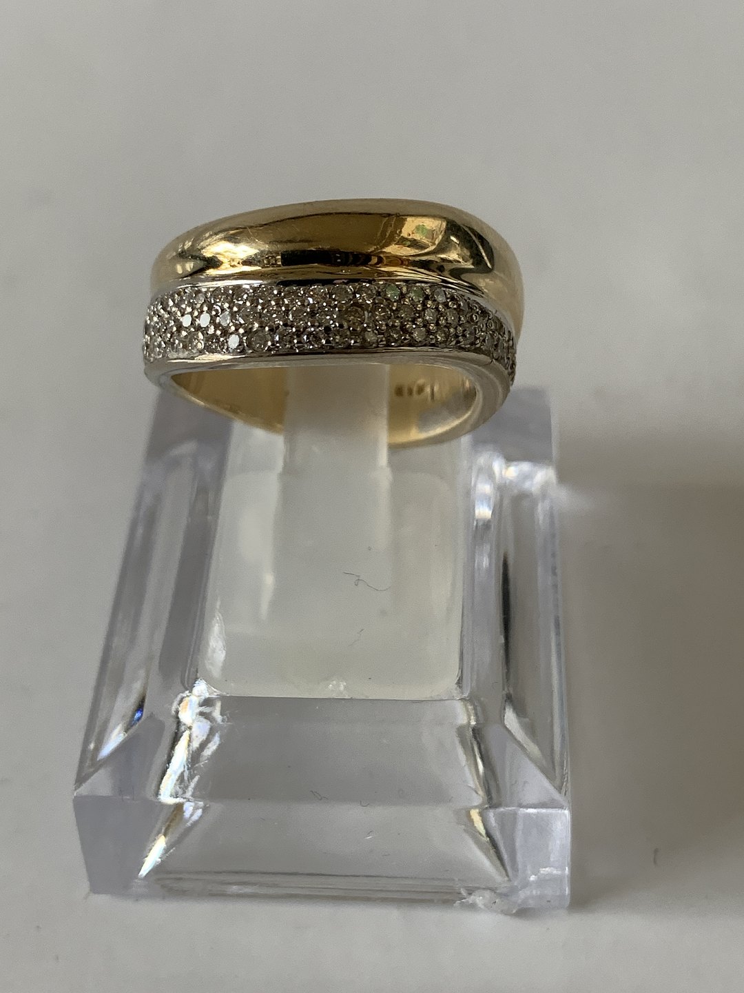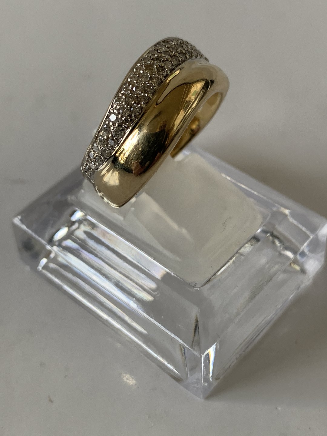 Flot og elegant damering i guld, og med flotte bløde former. Der giver ringen en flot levende look. De indlagte brillanter, giver ringen et enormt liv. Ringen kan bruges til både hverdag og fest, hvor den kan anvendes alene eller i kombination med andre ringe.