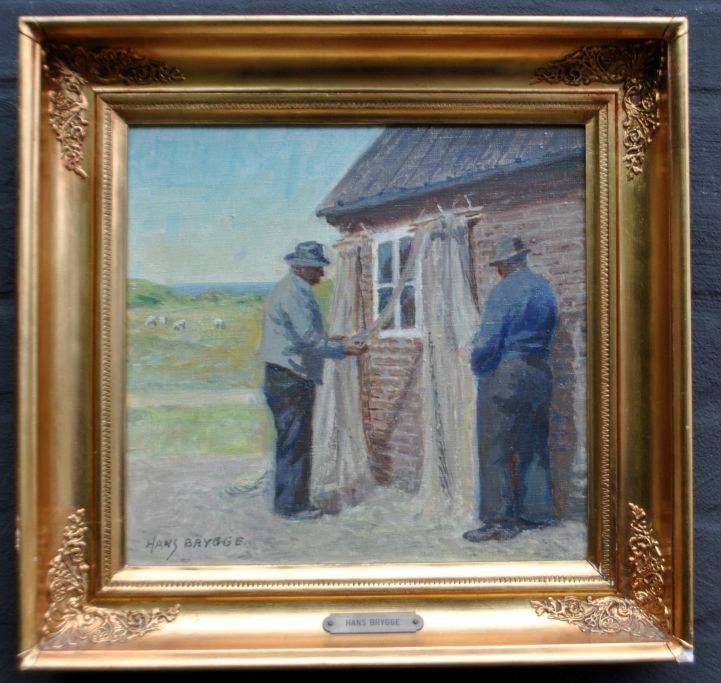 Brygge, Hans (1885 - 1979) Danmark: Fisker med nål. Olie på lærred. Signeret. 29 x 28 cm.  Indrammet: 37 x 38 cm. I en hjørnedekoreret ramme.
