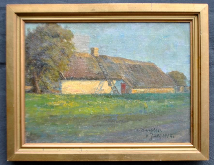 Larsen-Særsløv, Frederik (1870 - 1942) Denmark. A farm in the sunset. Oil on canvas. Signed 5 July 1912. 30 x 32 cm.