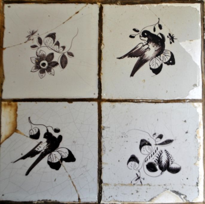 Firpas, Fliser, fajance, "Schleswig blomst", "lille blomst"  og to fliser med fugle. 19. årh. Tyskland. 26 x 26 cm.