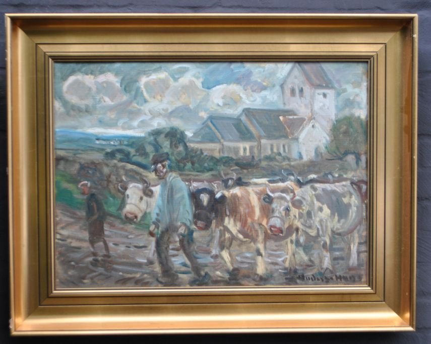 Hune, Anders (1894-1968) Denmark: Cows at village church. Oil on canvas. Signed: Anders Hune. 48.5 x 67 cm.