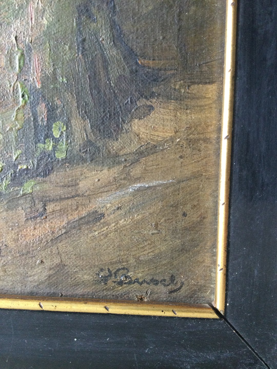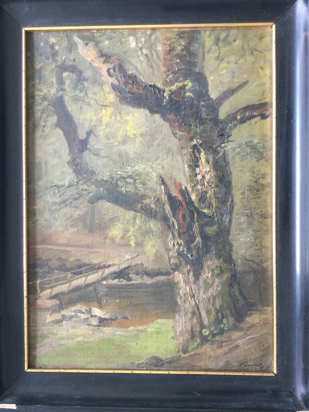 Maleri af Peter Busch - Skovparti med bro over bæk.