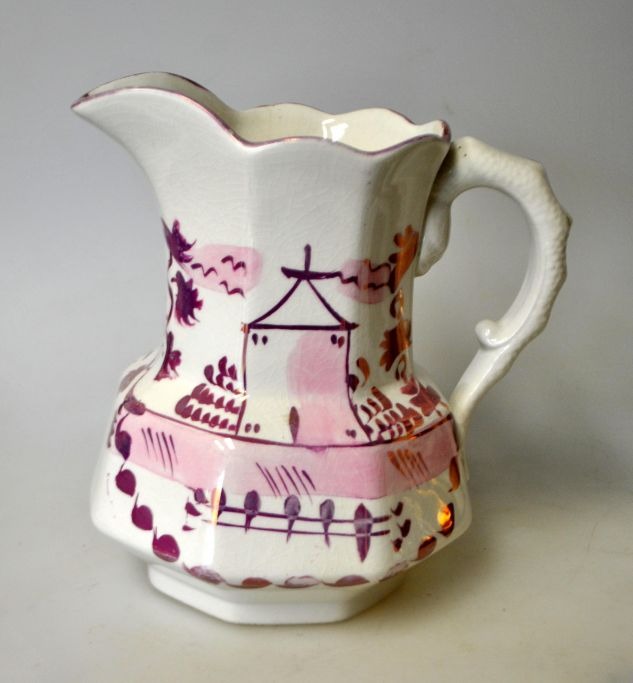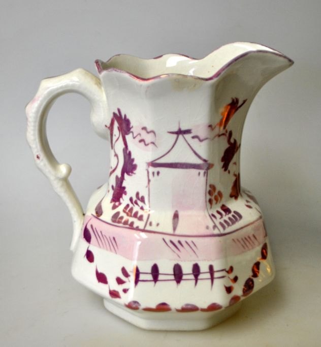 Engelsk fajance kande, Allertons, 19. årh. Hvid fajance, med håndmalede dekorationer af bygninger i lustra. H.: 15 cm.