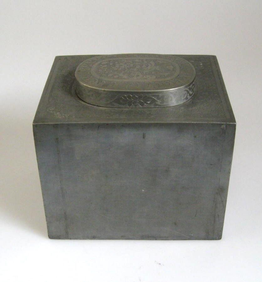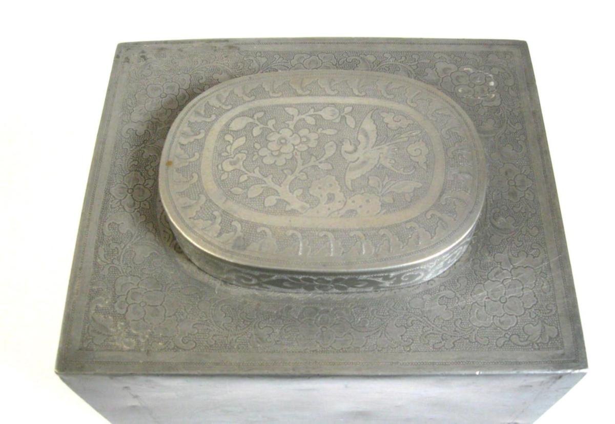 Kinesisk tedåse i tin, 19. årh. Med rektangulær glat korpus. Med oval låg. Dekoreret på toppen og låget med blomster og fugle. L: 18,5 cm. B:15,5 cm. H:16,5 cm.