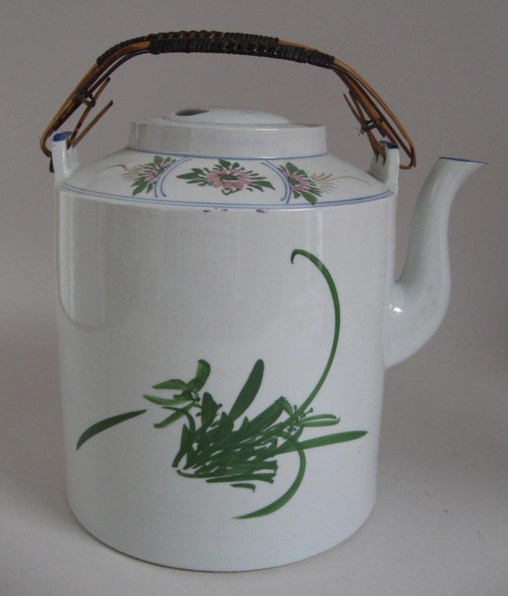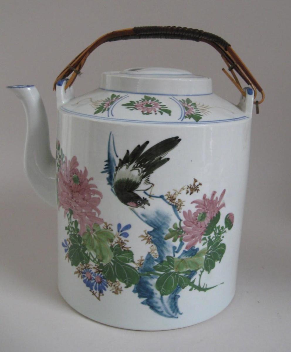 Kinesisk the kande i hvidt porcelæn, 20. årh. Med polykrom dekoration i form af fugle, buske og blomster. Med låg og hanke i bast. H.: 25 cm.