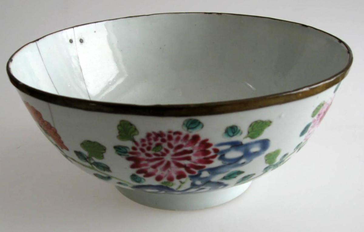 Famille Rose bowle, 19. årh. Kina. Flerfarvet emaljemaleri med strøblomster og kantdekortion. Repareret/klinket med messingkant. H.: 9,5 cm. Dia.: 20,5 cm.