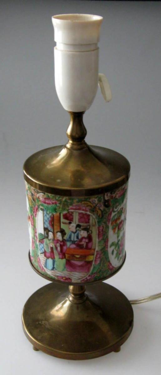 Famille rose penselbæger, 19. årh. Omgjort til lampe. Polykrom dekoration med fugle og persongrupper. På rund fod i messing og top. Højde incl. fatning: 33 cm.