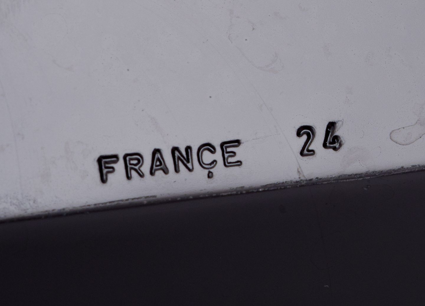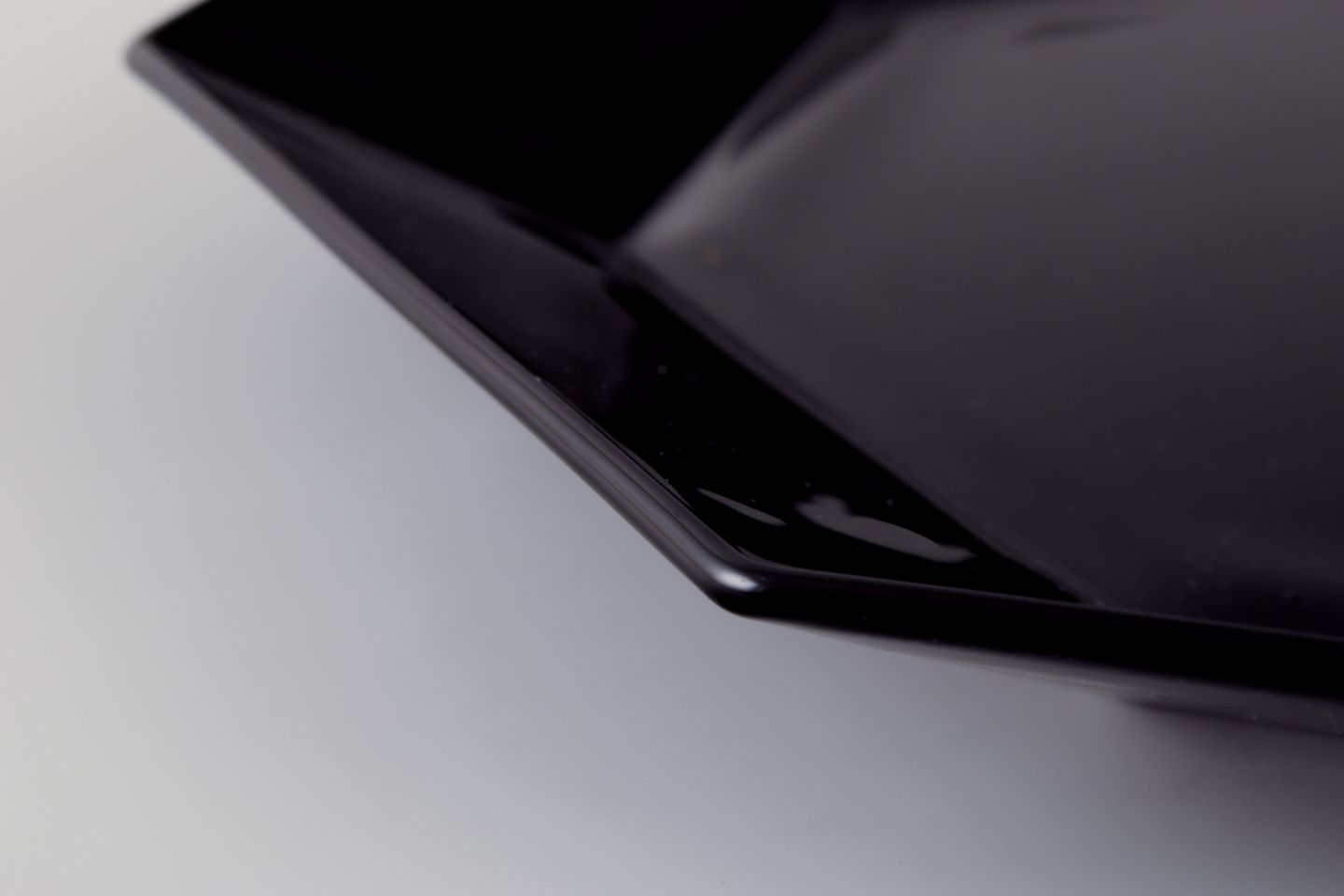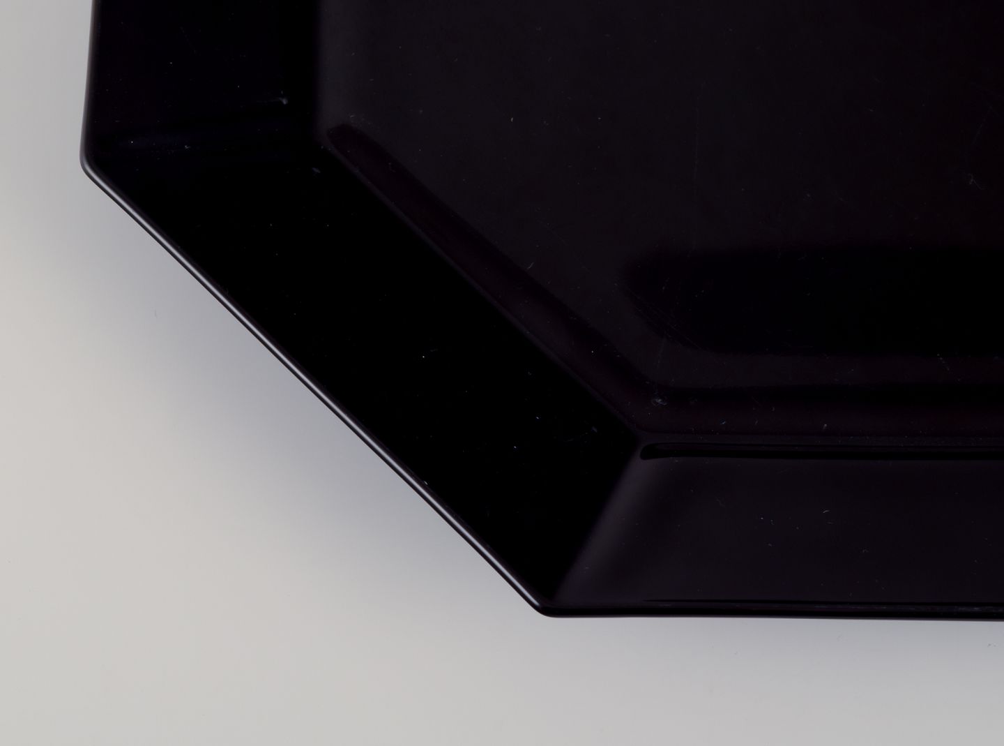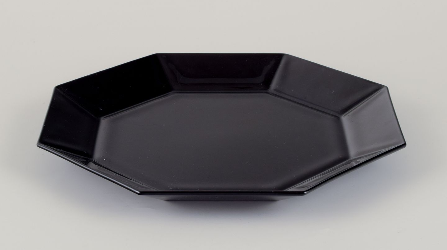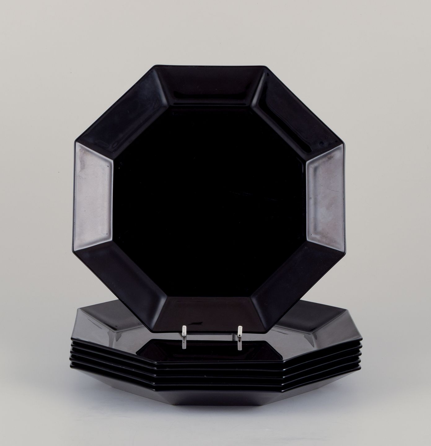 Et sæt på seks ottekantede middagstallerkner i sort glas.