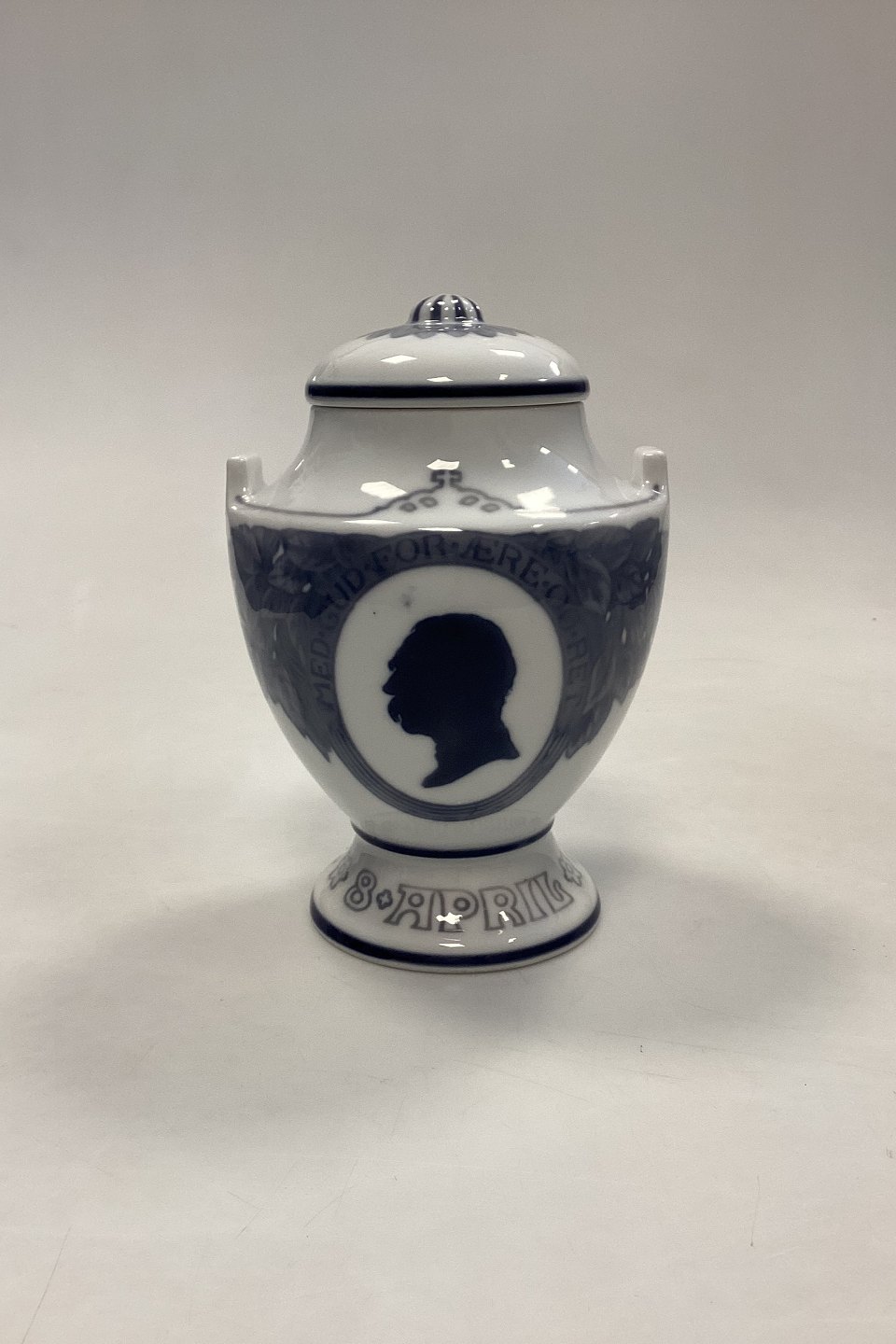 Royal Copenhagen Vase med låg 8.April 1818-1918. I anledning af 100-året for Christian d. IX´s fødsel. Måler 17,5 cm / 6,88 in. 2. Sortering med glasurfejl over kongens hoved.