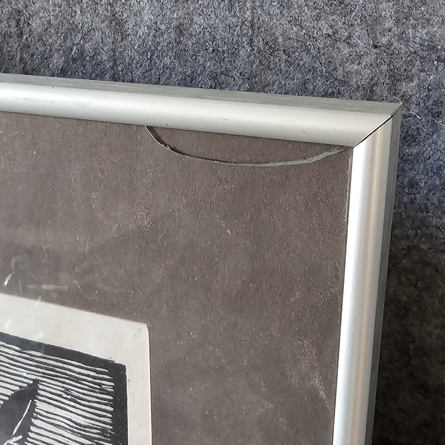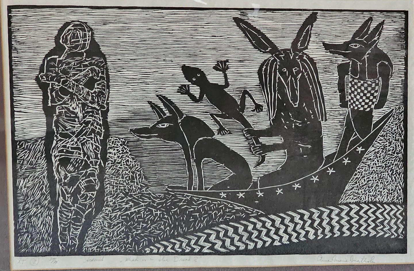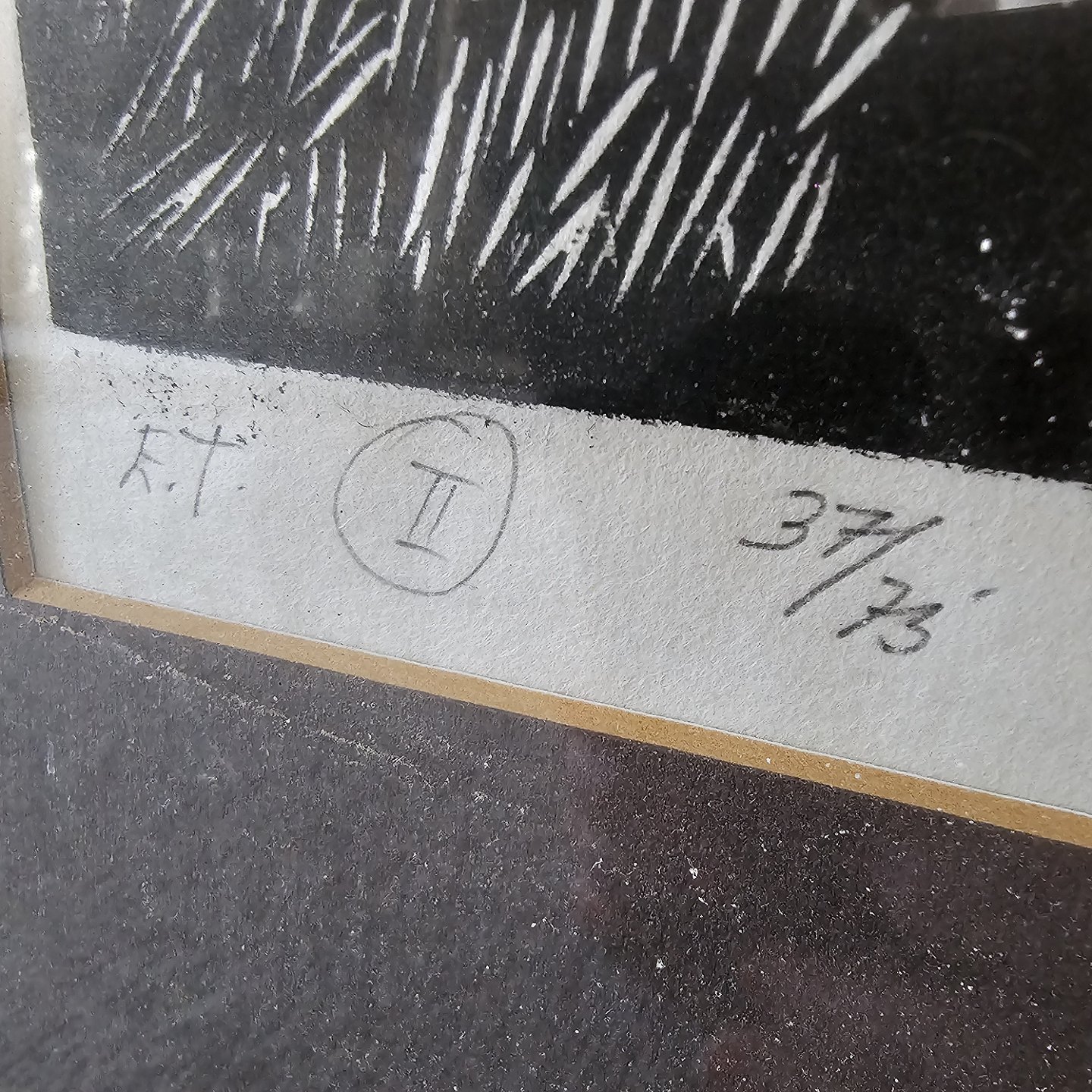 Indrammet træsnit med sort passepartout i aluminiumsramme med titlen What is in the dark 2 nr. 37/73
