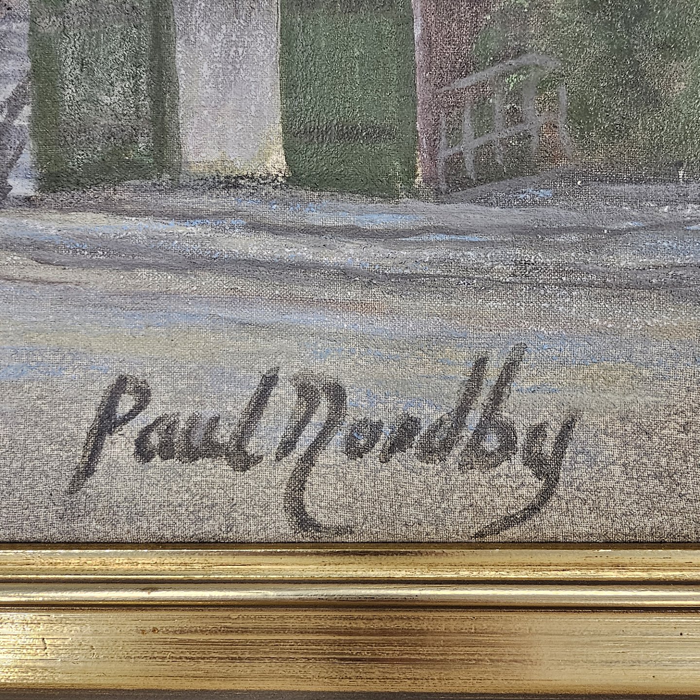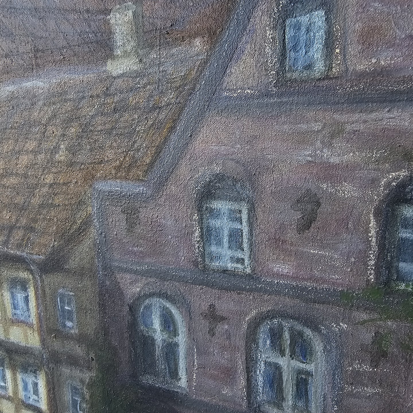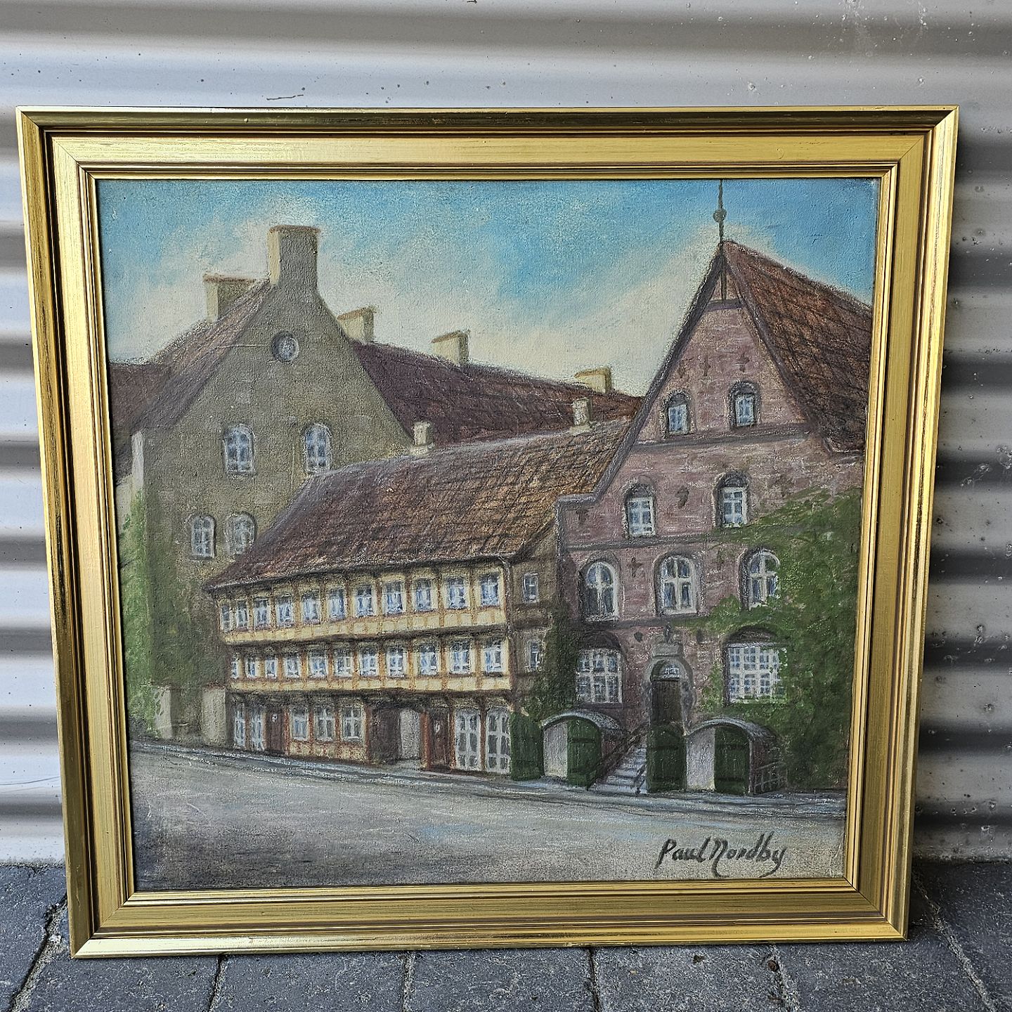 Maleri på lærred i gylden træramme med motiv af bygninger på Østerågade i Aalborg