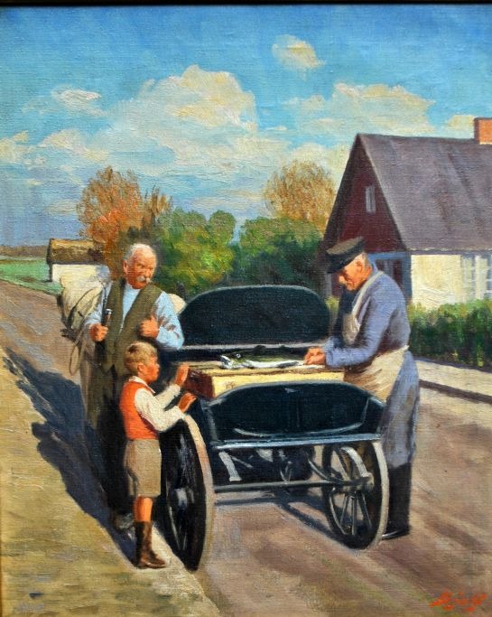 Bjulf, Søren Christian (1890 - 1958) Danmark: Fiskemanden på besøg. Olie på lærred. Signeret. 55 x 45 cm.