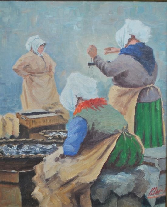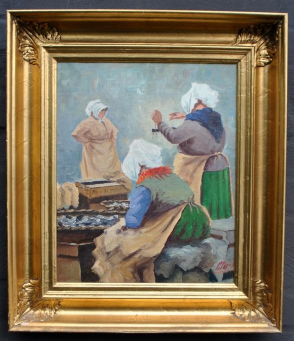Mortensen, Christian (1908 - ) Danmark: Fiskekonerne på Gammel Strand. København. Olie på lærred. Signeret. 40 x 32 cm.