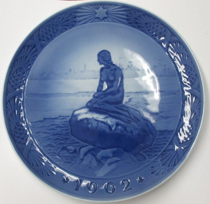Royal Copenhagen juleplatte, 1962, København, Danmark. Blå malet. Dekoreret med Den lille Havfrue ved Vintertid, København. Dia.: 18,5 cm.  1. Sortering.  2 på lager.