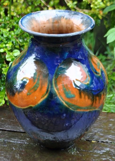 Dansk keramiker (20. årh): Stor gulvvase. Glaseret ler. Glasurer i gult, rødt, blåt og grønt. Usigneret. H.: 30 cm.