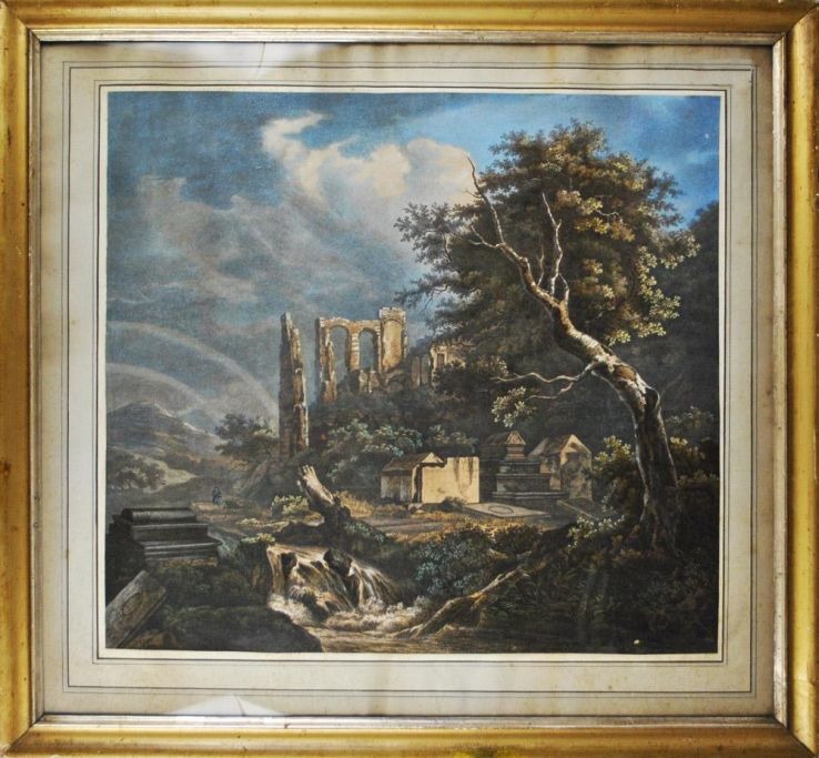 Tysk kunstner, 19. årh. Romantisk landskab. Håndkoloreret kobberstik. Usigneret. 63 x 68 cm.