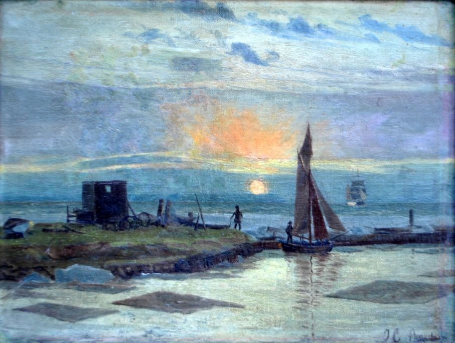 Danish artist (19th century): Sails are in the water in a small fishing port