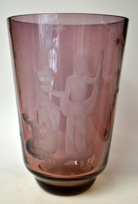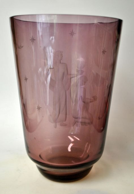Glasvase, violet, 1949, Kumelo OY, Finland. Design: Sulo Tommola. Indgraverede dekorationer med kvinder med olielamper og stjerner.  Signeret. H.: 25 cm. Dia: 17 cm.