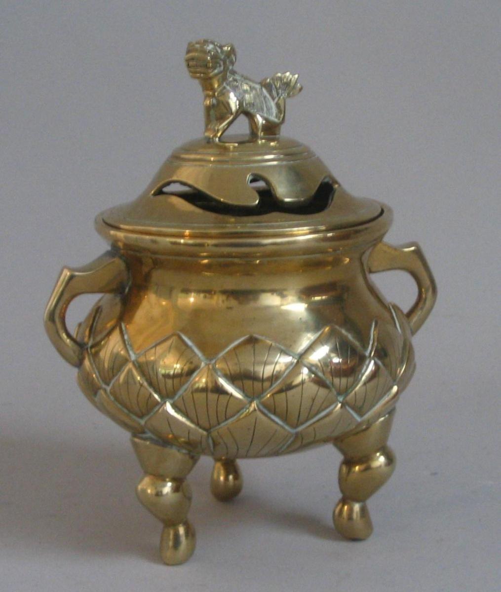 Kinesisk røgelseskrukke i bronze på tre ben, med to ører; gennembrudt låg med dekoration i form af løve. H.: 17 cm. B.: 14 cm. Stemplet.: Udformet i Nordkina.