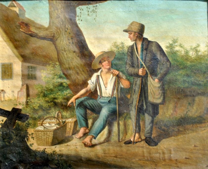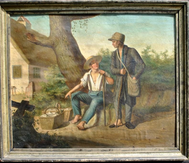 Tysk kunstner (19. årh.): Gårdeksteriør med to vandringsmænd, der holder hvil. Usigneret. olie på pap. 36 x43 cm.