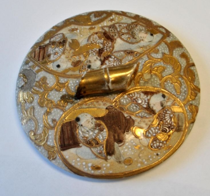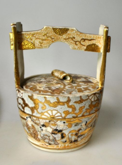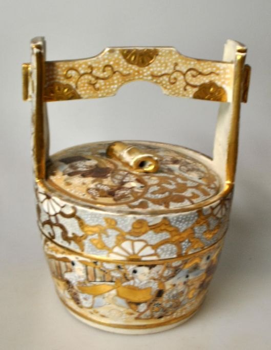 Japansk satsuma fajance kurv med hank og låg, Meiji, 19. årh.