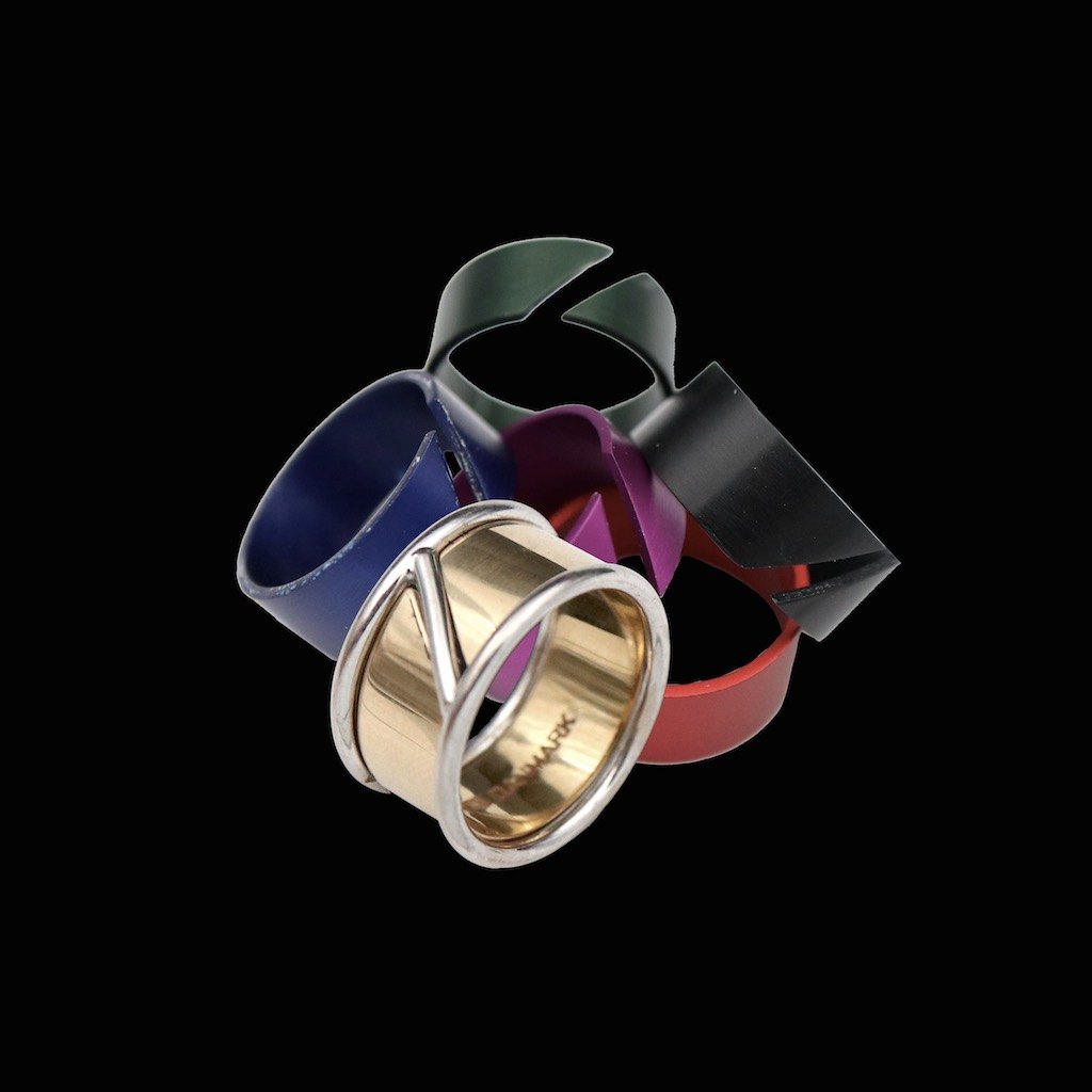 Ring 18k hvidguld med midterring i 18k guld samt udskiftelige ring i farvet aluminium.